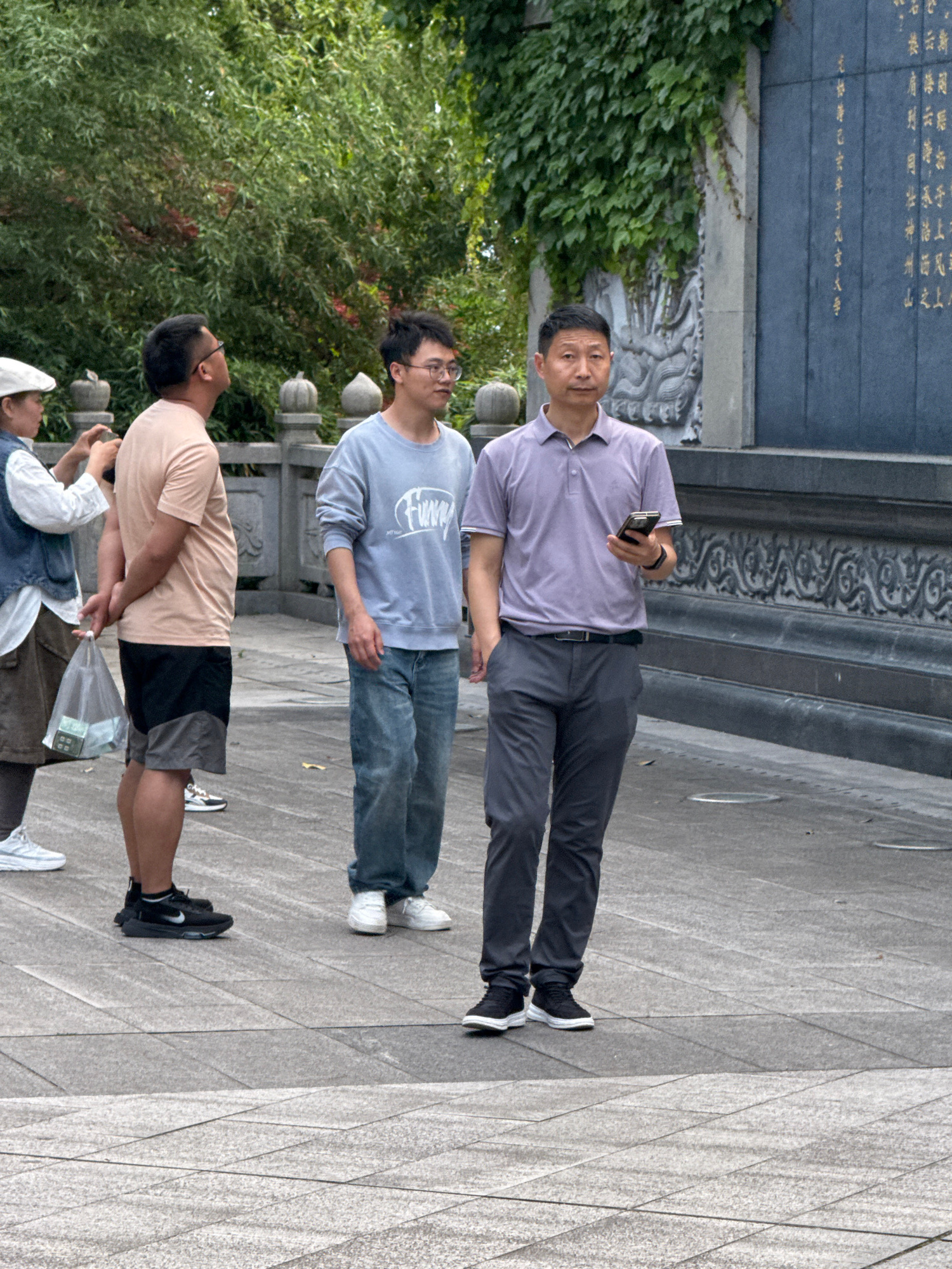 The image shows three people standing on a grey tiled walkway next to a low, ornate stone fence bordering a lush green area. In the background, a tall stone structure is visible, possibly a monument,…read more