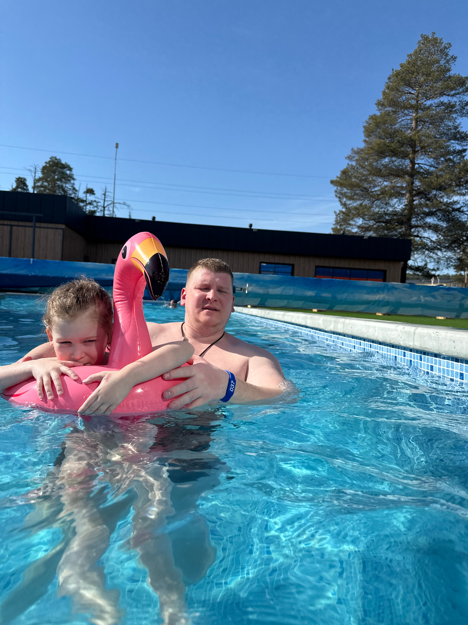 A man and a child are in a swimming pool, with the child inside a pink flamingo-shaped inflatable. The man has a blue wristband marked "037". The pool has a blue tile edge and is surrounded by a build…read more