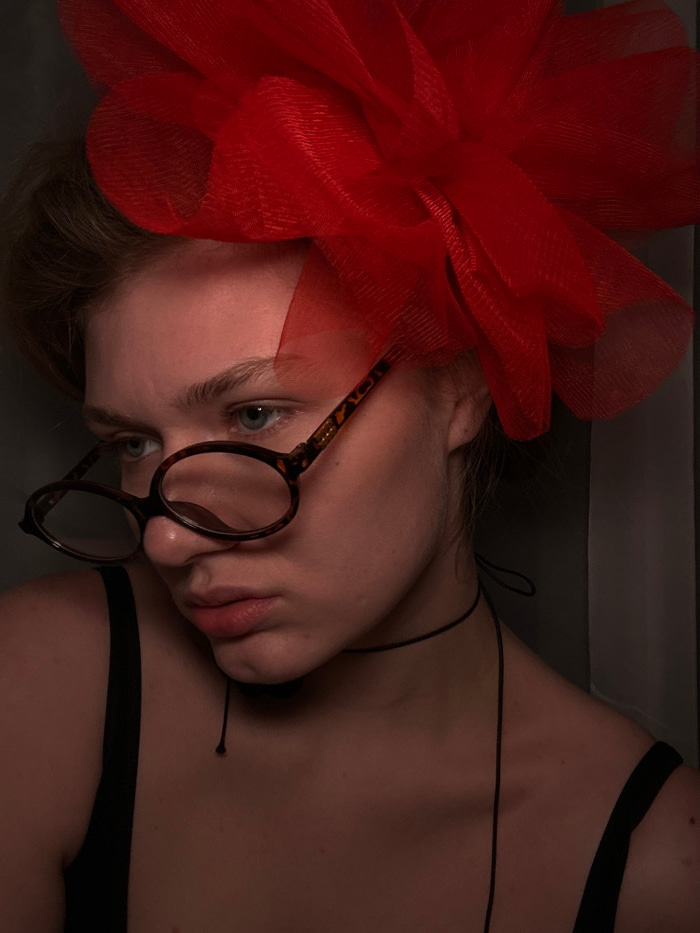 This close-up portrait features a female individual, likely indoors. The specific location within Kazan, Russia, cannot be determined from the image, which displays a plain, dark fabric background, po…read more