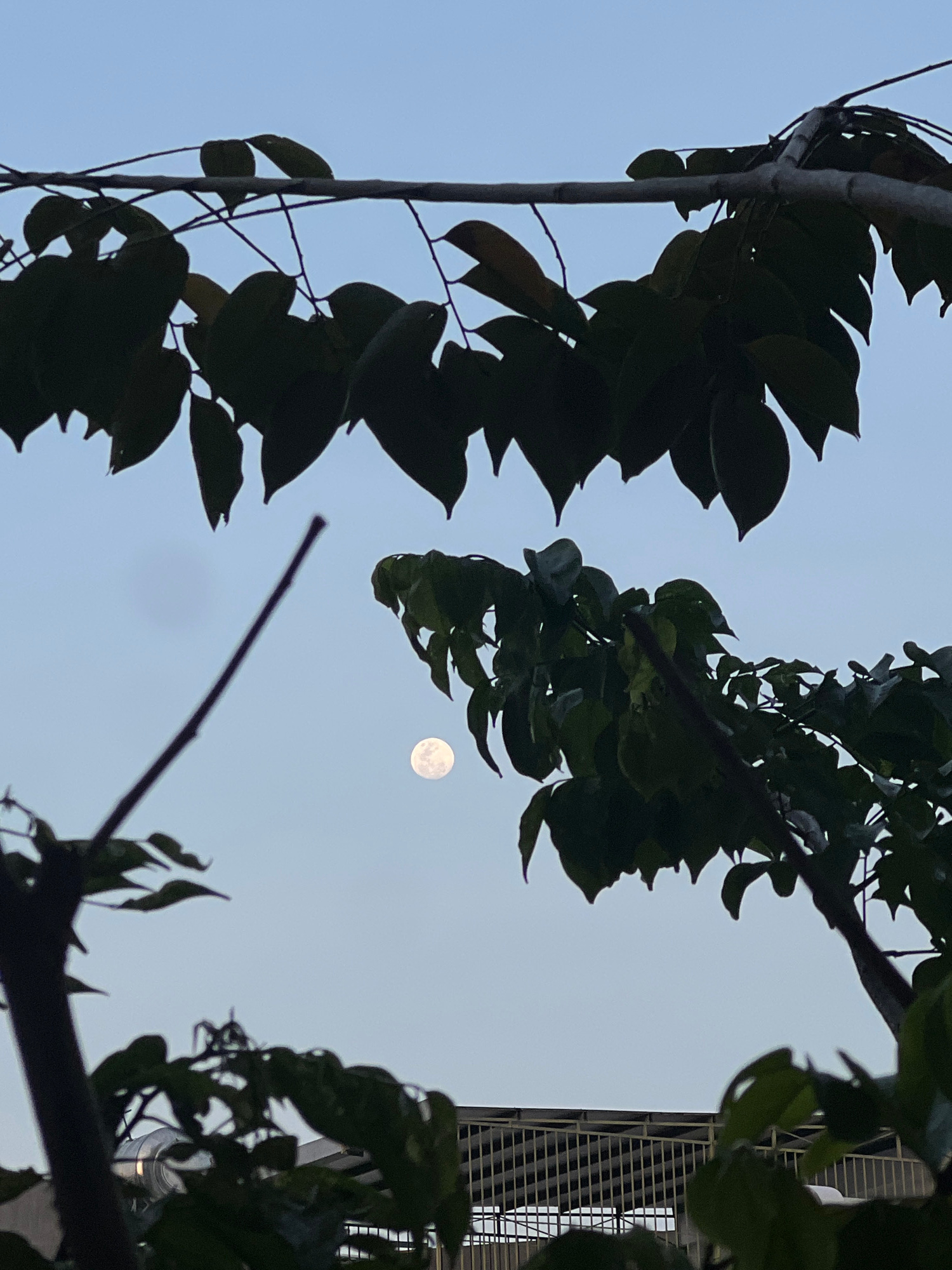 The image depicts a partial view of the sky, possibly at dusk or dawn, with the moon visible through the branches and leaves of trees. The branches and leaves are dark, creating a silhouette against t…read more