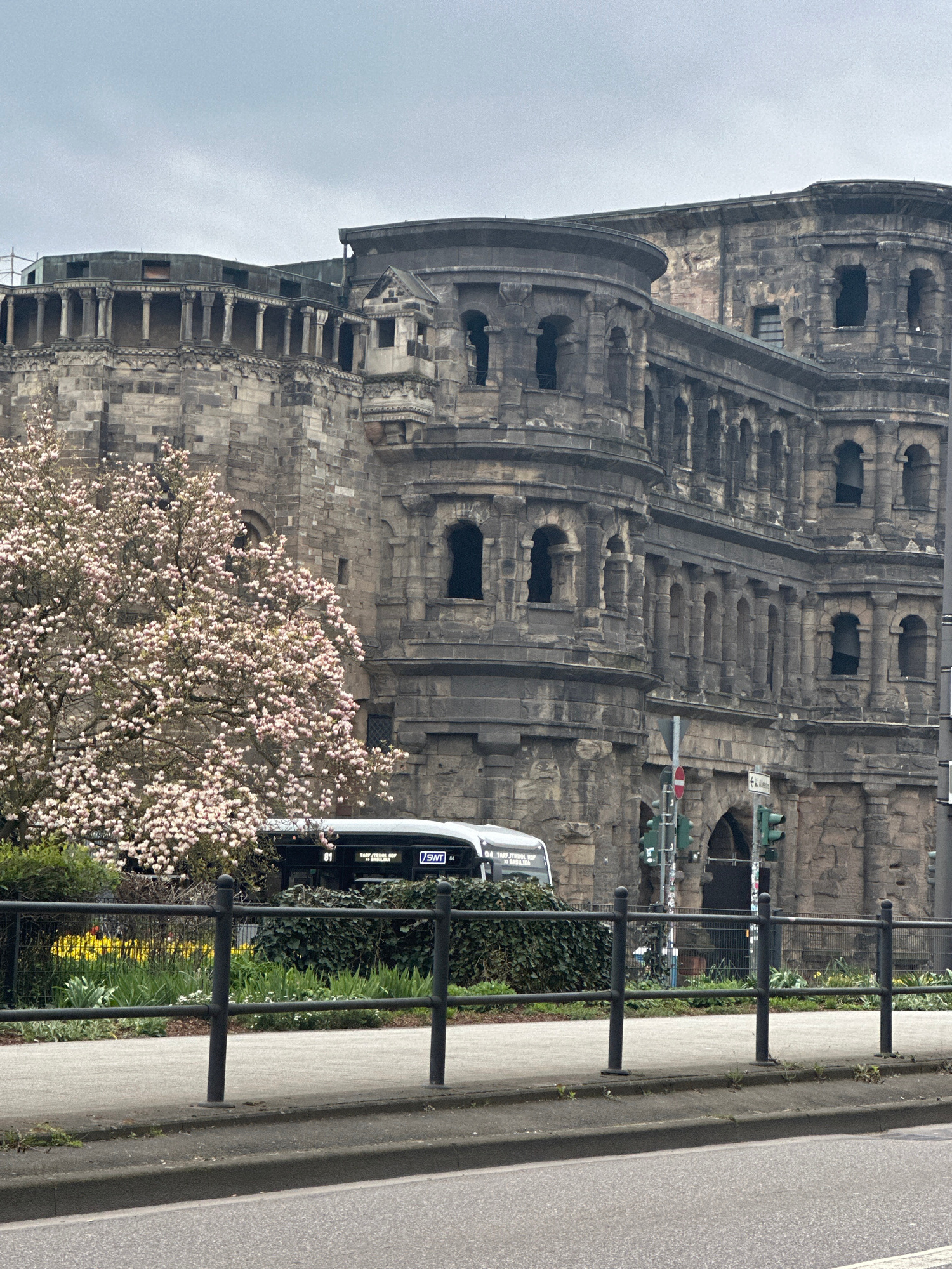 The Porta Nigra, a large Roman city gate in Trier, Germany, is visible to the left, standing as a prominent, multi-layered stone structure. A flowering tree with light pink blossoms is situated at the…read more