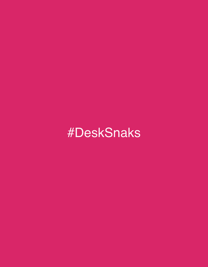 The image shows a solid pink background with the hashtag "#DeskSnaks" written in white, centered in the frame. There is no information about the location, people, subjects, objects, actions, interacti…read more