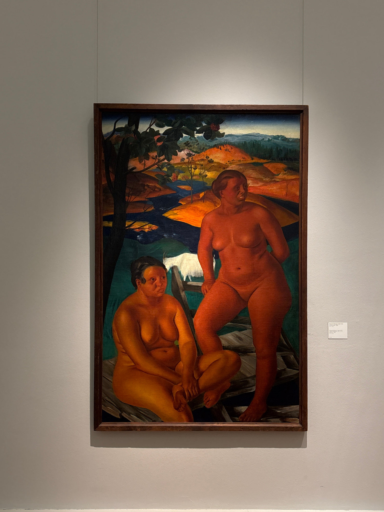 The image shows a framed painting hanging on a light gray wall. The painting depicts two nude female figures in a landscape. The upper figure is a reddish-brown color, while the lower figure is a gold…read more