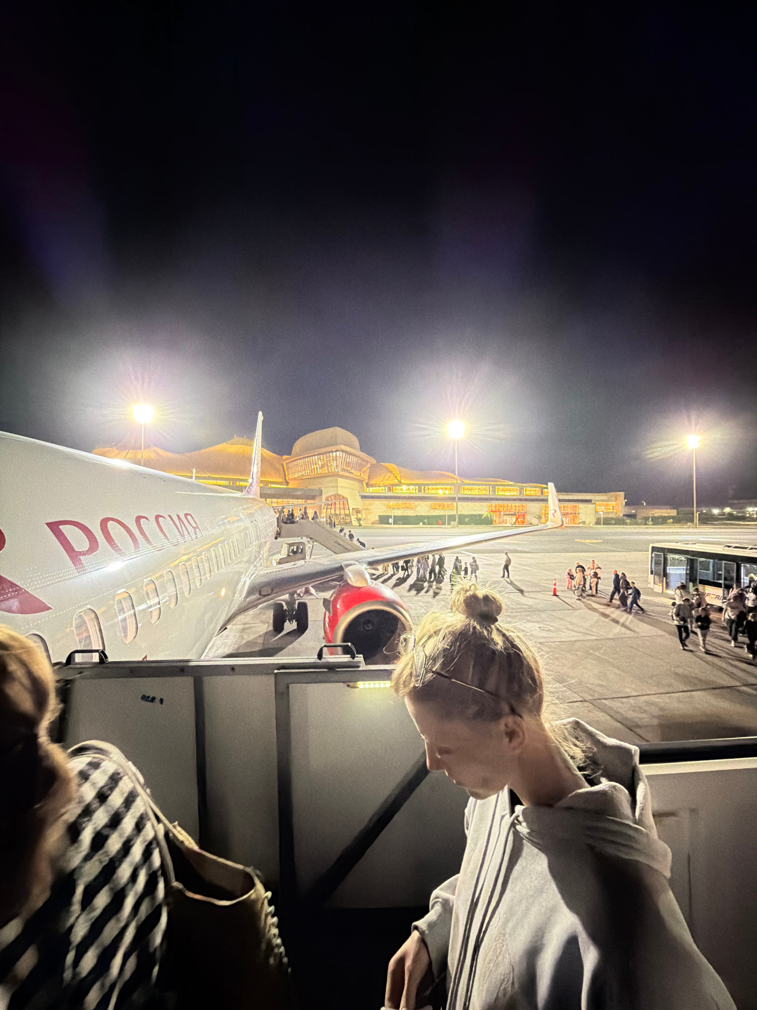 At an airport in the city of Unknown, Egypt, it is night. People are disembarking from a Rossiya aircraft. One person, wearing a grey hoodie, is standing near the aircraft door and looking down. Anoth…read more