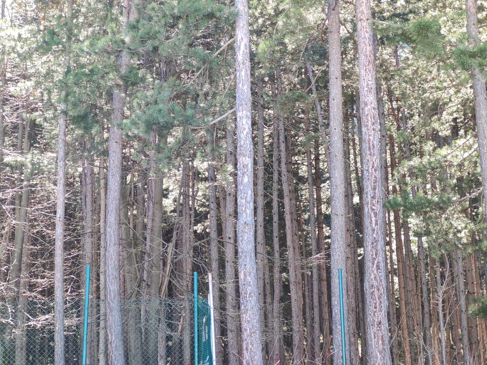 The image depicts a densely wooded area located in Vratsa, Bulgaria. Predominantly composed of coniferous trees with tall, slender trunks, the forest extends beyond a chain-link fence in the foregroun…read more