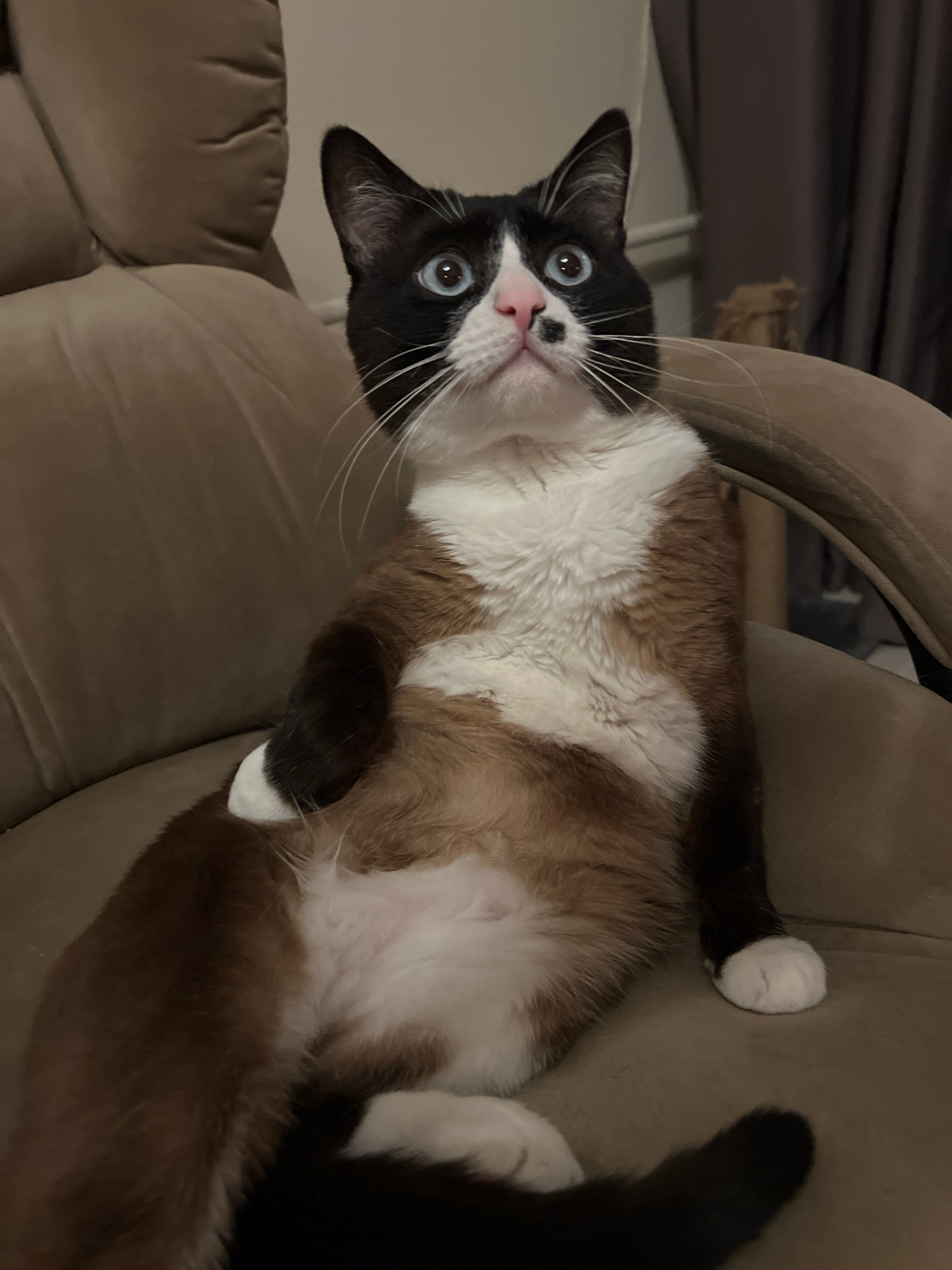 An indoor scene features a domestic cat positioned on a light brown, upholstered armchair. The cat's fur displays a black, white, and brown pattern: its face is black with a white muzzle, a distinct w…read more