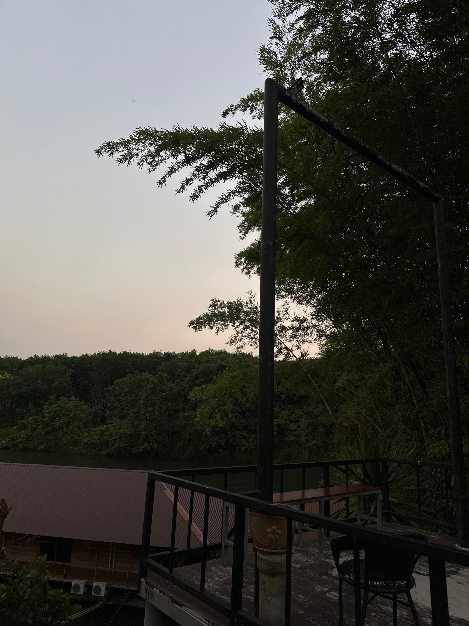 This outdoor shot, taken in Sai Yok, Thailand, features a metal structure extending from a balcony. The balcony, with railings and a wicker chair, overlooks a lush, dense forest. A building with a cor…read more