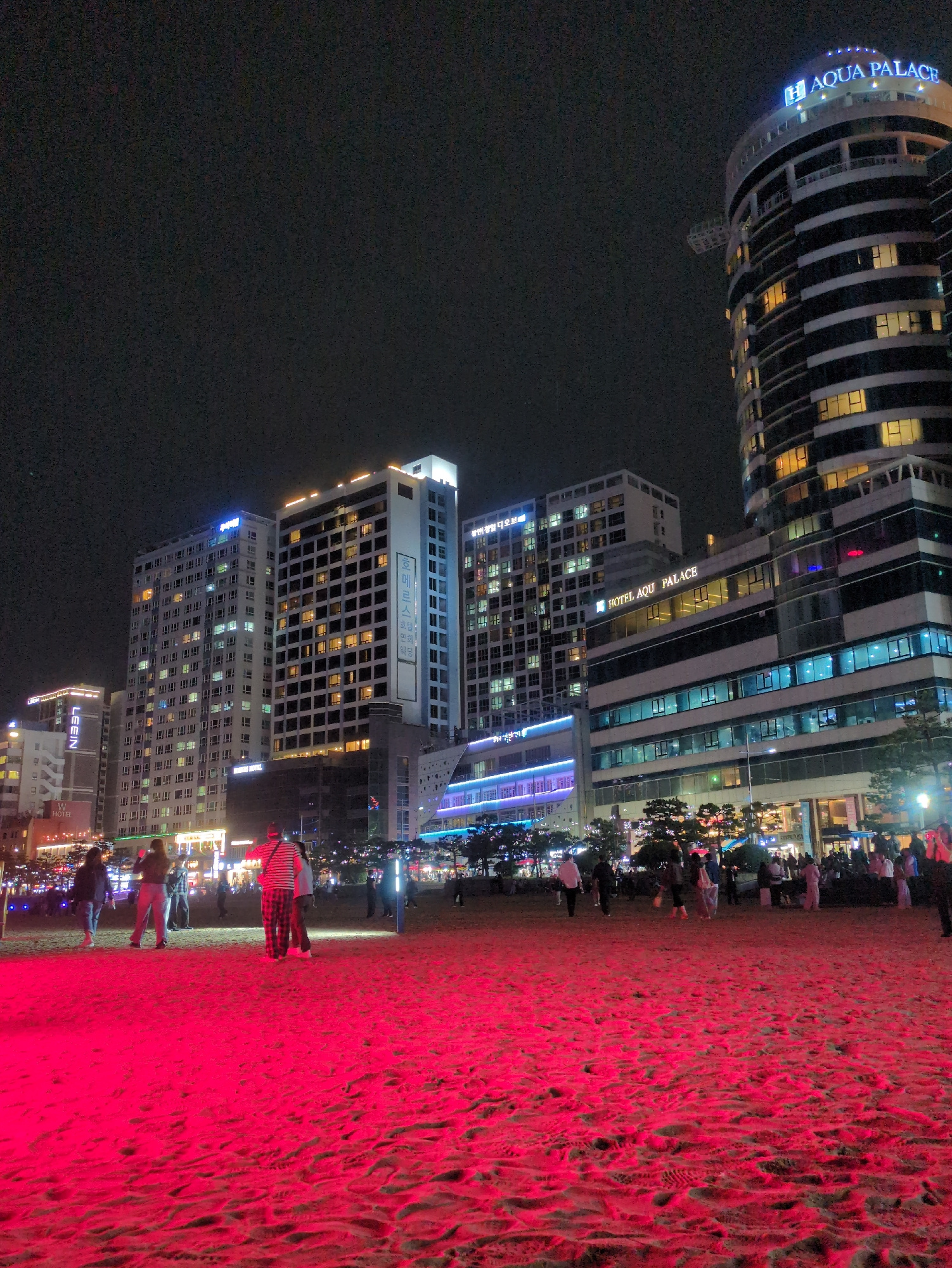 At night, Busan, South Korea’s Haeundae Beach is crowded with people. Buildings, including the Aqua Palace, Haeundae I Park, W Hotel, and Hotel AOU Palace, line the shore. The sand is bathed in red li…read more