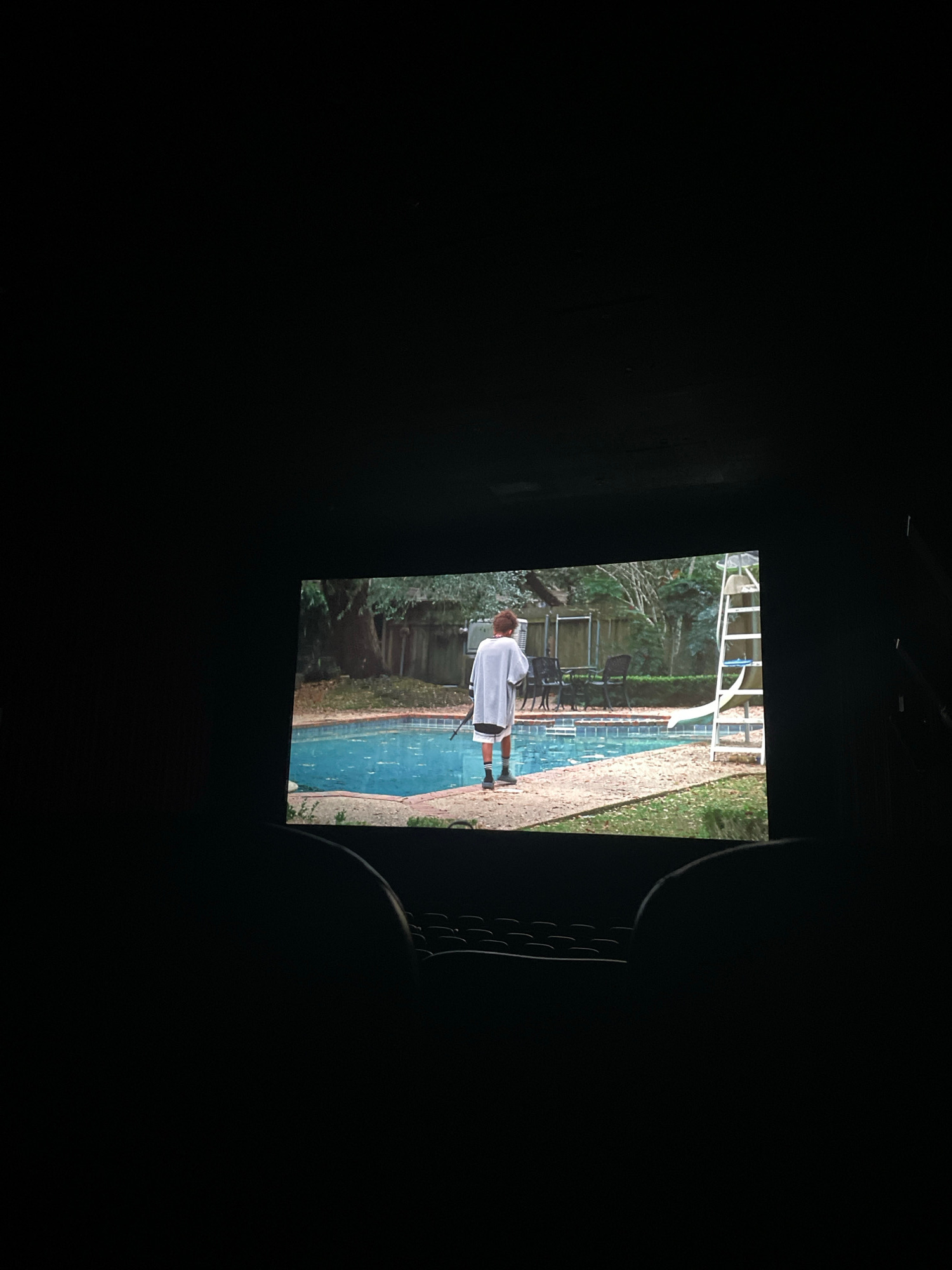 The image shows a person standing near a swimming pool, visible through what appears to be a projection screen. The person is wearing a light-colored shirt and dark shorts, and is standing on the pool…read more
