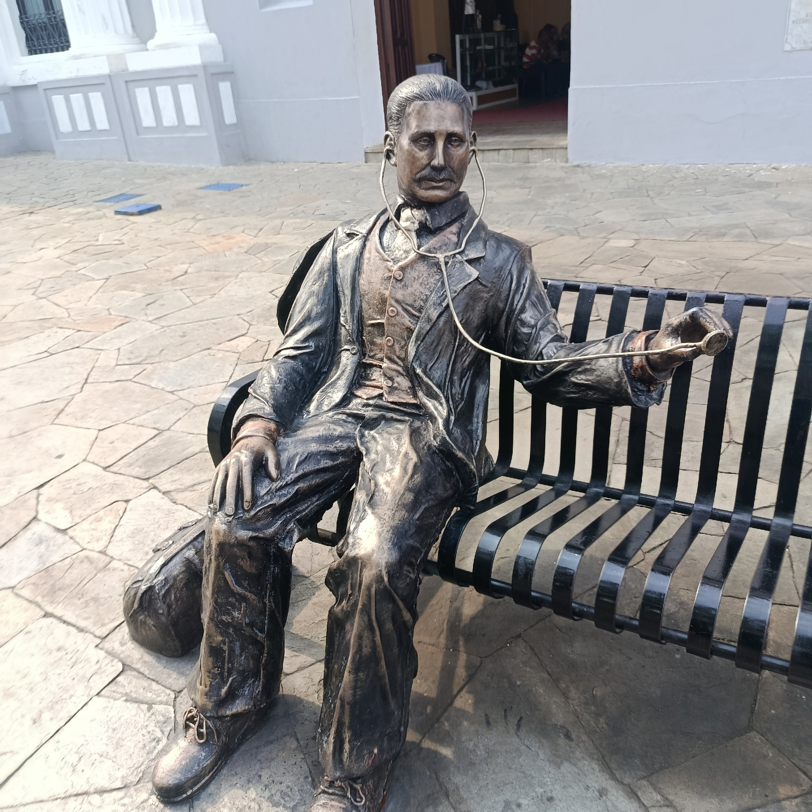 The image shows a bronze statue of a seated man with a mustache, wearing a suit and a stethoscope around his neck. He is sitting on a black metal park bench. Behind the statue is a light gray building…read more