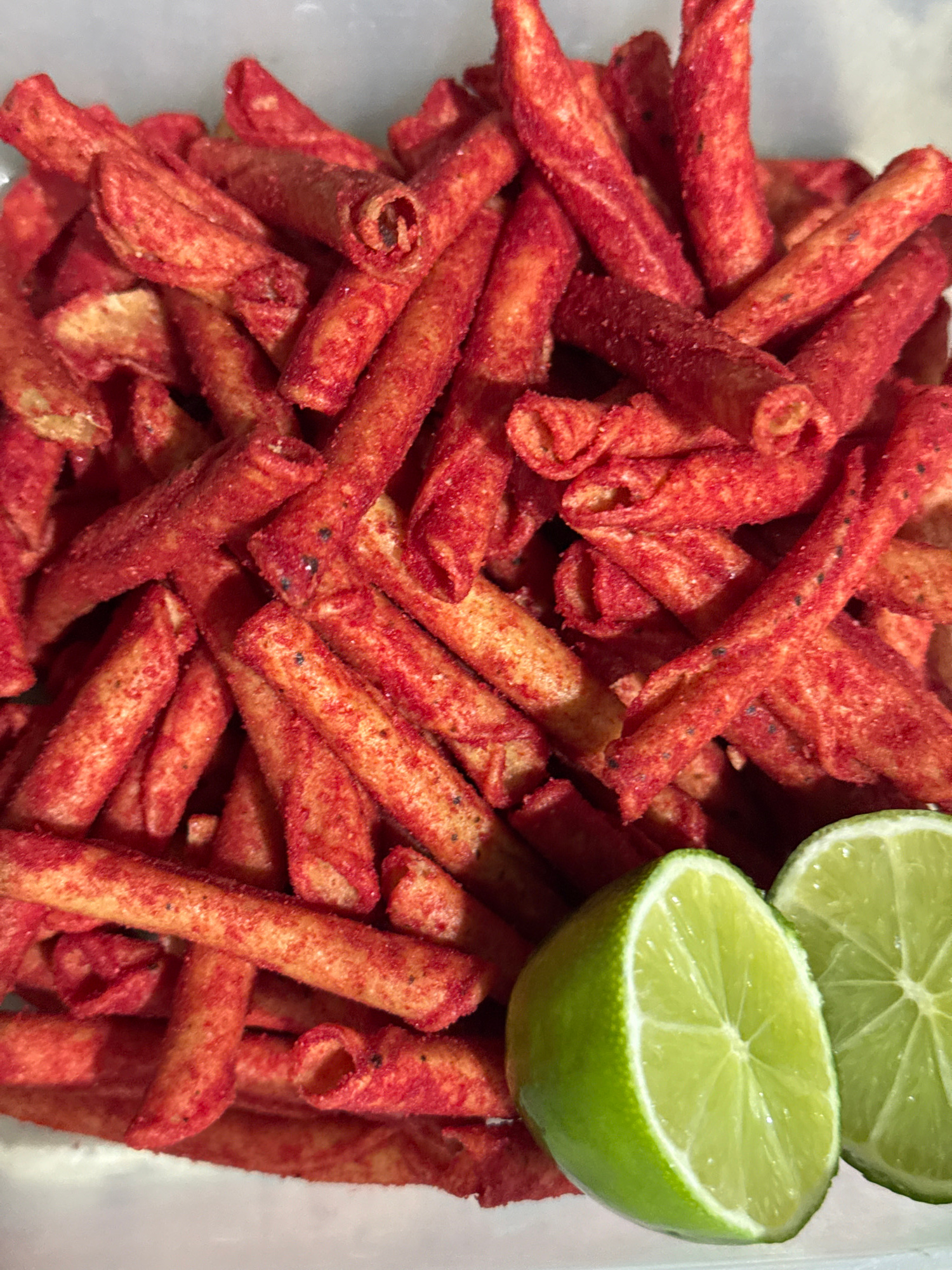 A close-up, high-angle shot captures a generous pile of red, rolled corn chips, likely Takis, within a clear or translucent container. The chips are uniformly cylindrical, covered in a vivid red seaso…read more