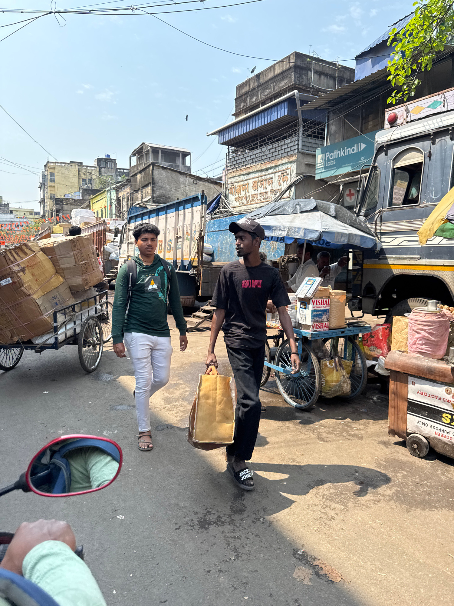 The image depicts a busy, sunlit urban street in Kolkata, India. This location is identified by the visible Bengali script on various signs and the presence of a "Pathkind Labs" signage, a diagnostic…read more