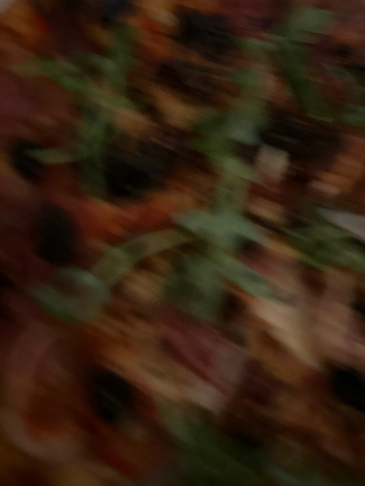 The image displays a severely blurred, top-down perspective of a circular food item, consistent with a pizza, originating from the city of Wealden, United Kingdom. The predominant colors are dark redd…read more