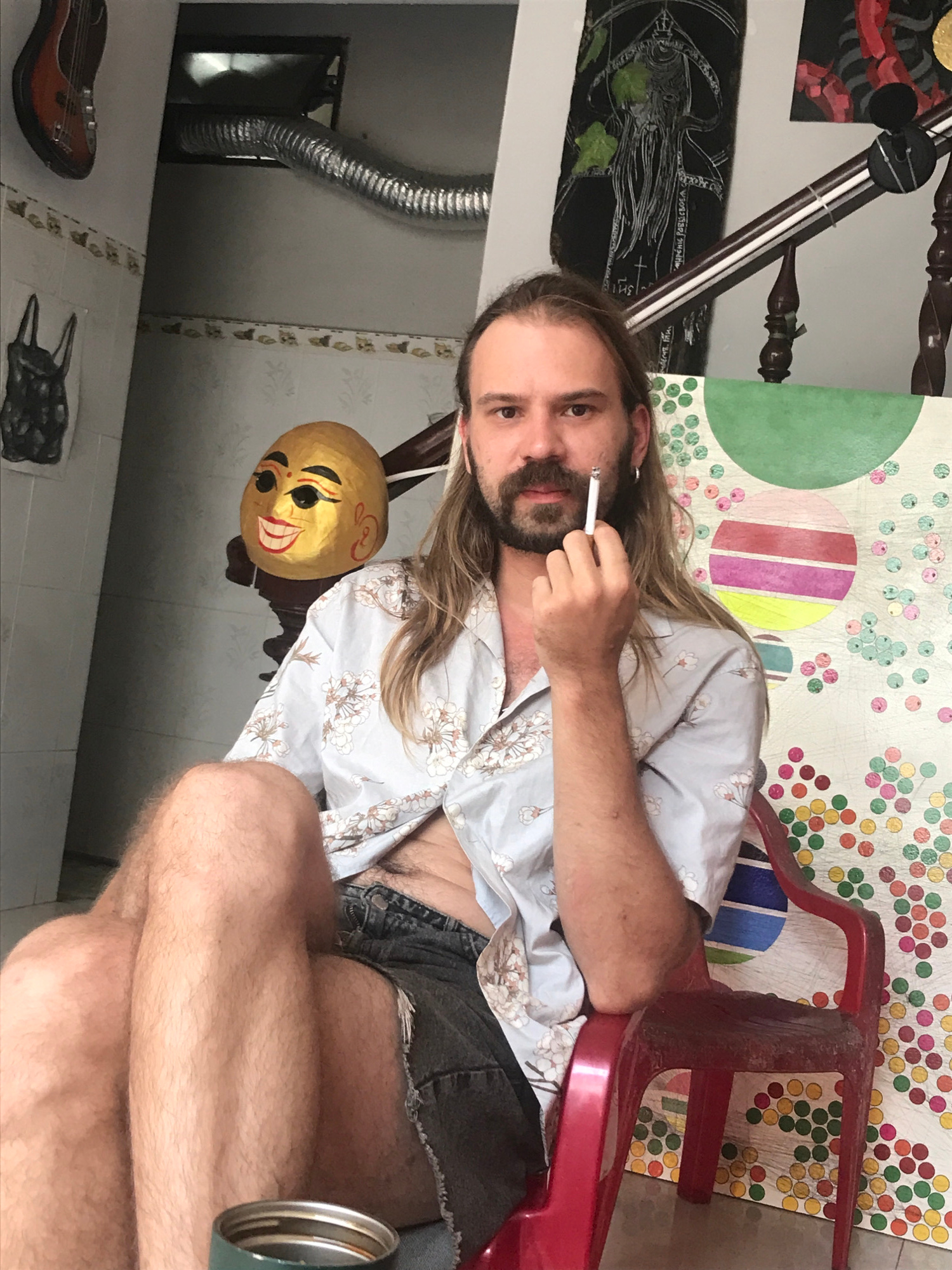 A person is sitting on a red plastic chair, holding a cigarette to their mouth. They have long hair and a beard. The setting appears to be indoors, possibly in Nha Trang, Vietnam, given the presence o…read more