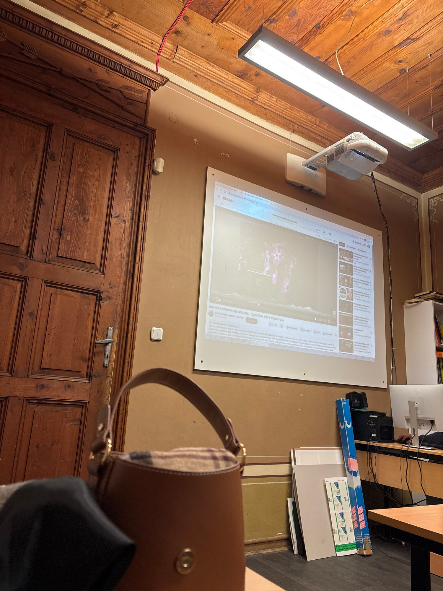 Here is a matter-of-fact description of the image: The image shows an indoor scene, seemingly a room with wood paneling on the walls and a large wooden door at the bottom. A rectangular light fixture…read more