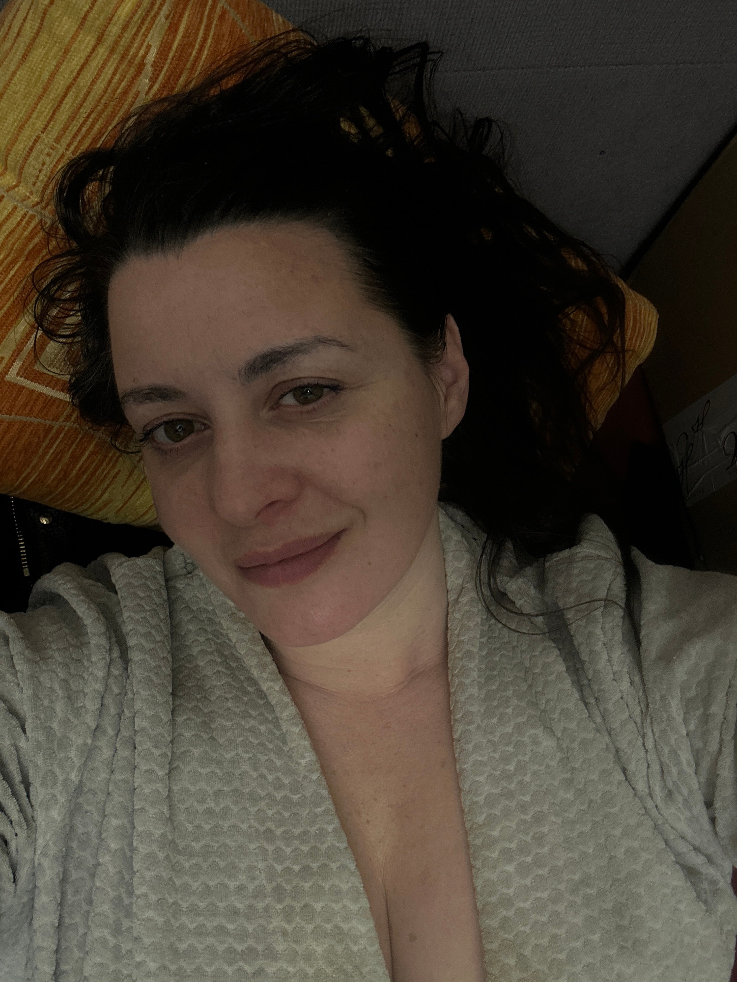 A middle-aged woman with dark hair rests her head on an orange patterned pillow. She is wearing a light gray textured robe and appears to be lying down. The background includes part of a dark surface…read more