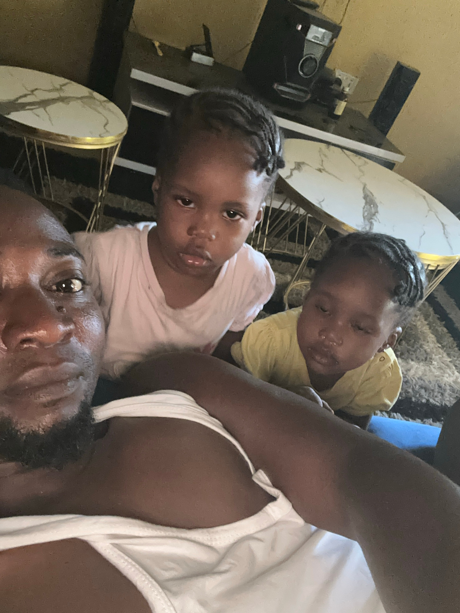 The image shows a man and two young children, possibly in a home setting. The man, who appears to be taking a selfie, is positioned at the bottom of the frame. One child is looking towards the camera…read more