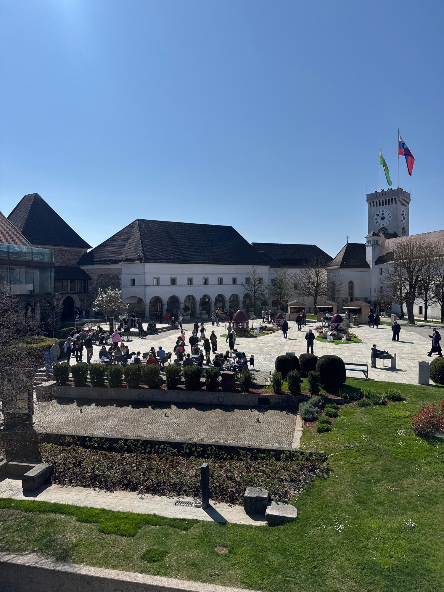 The image displays the main courtyard of Ljubljana Castle in Ljubljana, Slovenia, under a clear, cloudless blue sky, viewed from a slightly elevated position. Approximately 70-100 individuals are pre…read more