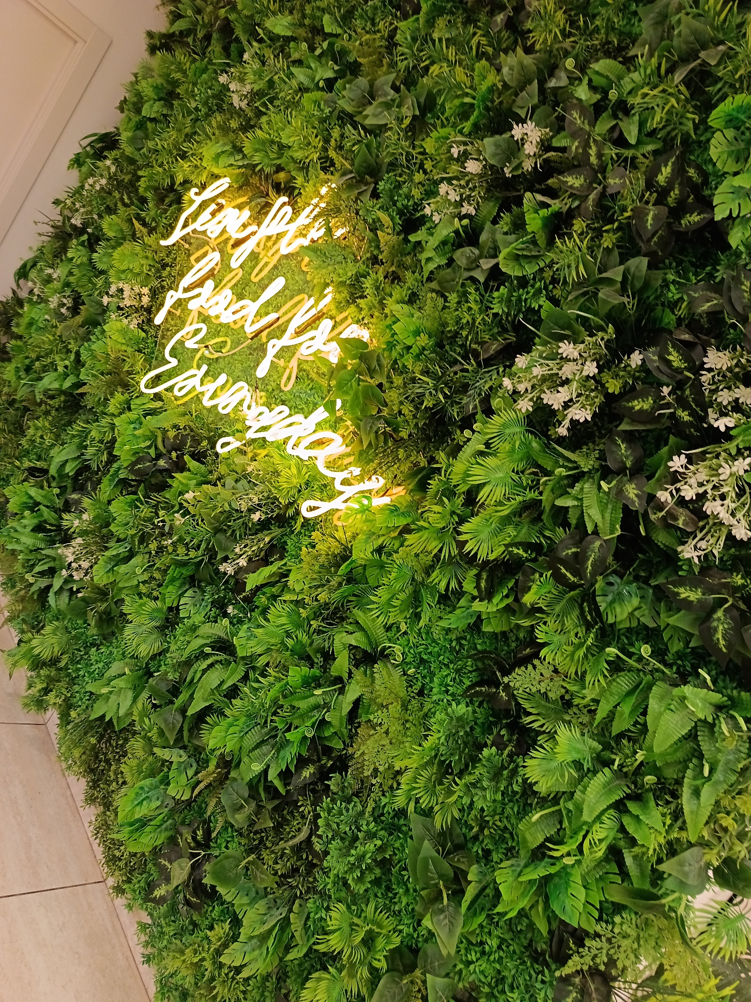The image depicts a vertical garden wall, densely covered in a variety of green plants and small white flowers. A neon sign in a cursive font, emitting a yellow light, is mounted on the left side of t…read more