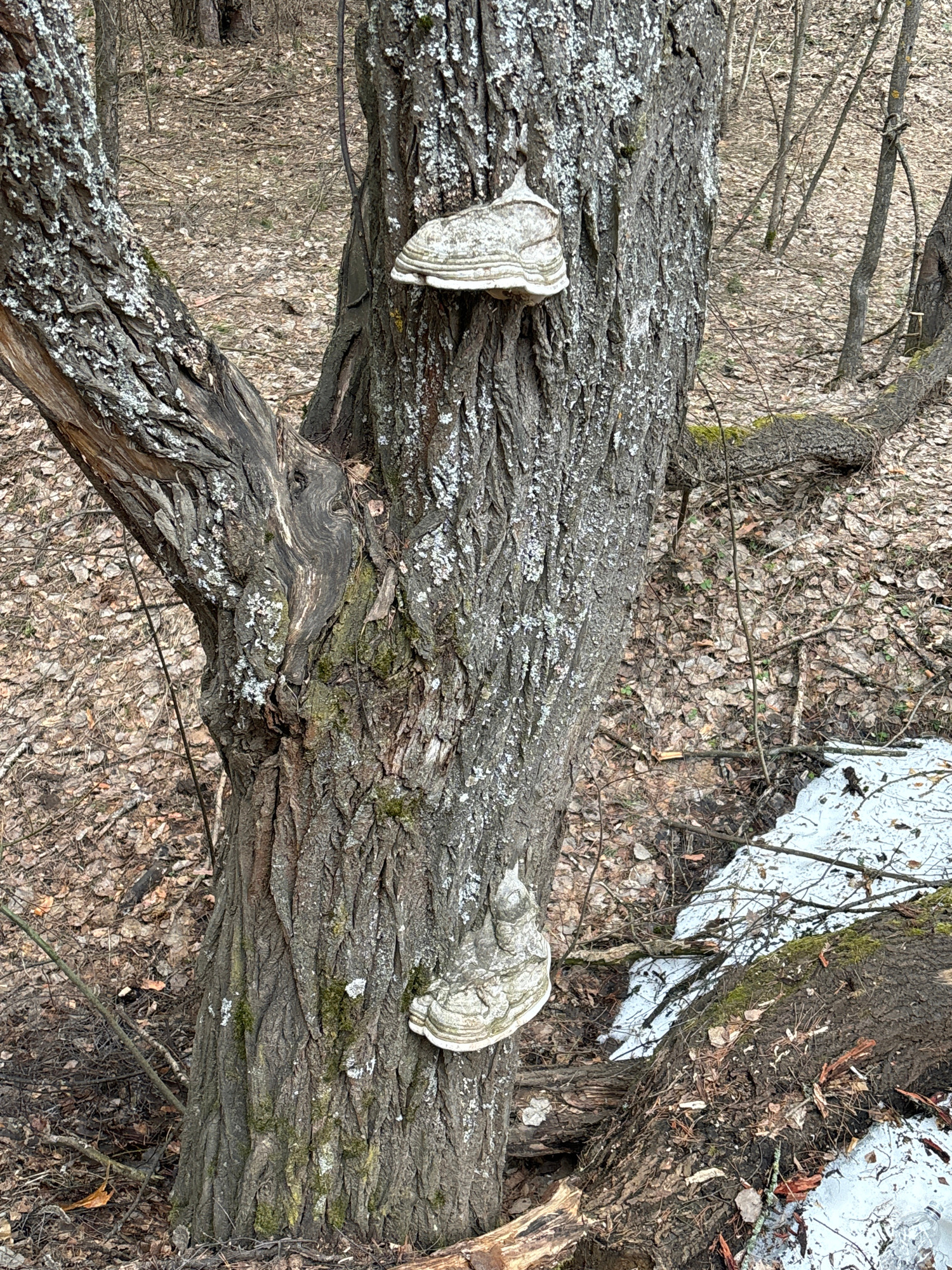 The image, captured in Chaikovsky, Russia, features a large, horizontally oriented tree trunk, likely fallen or heavily leaning. Its dark grey bark is deeply furrowed and extensively covered with nume…read more