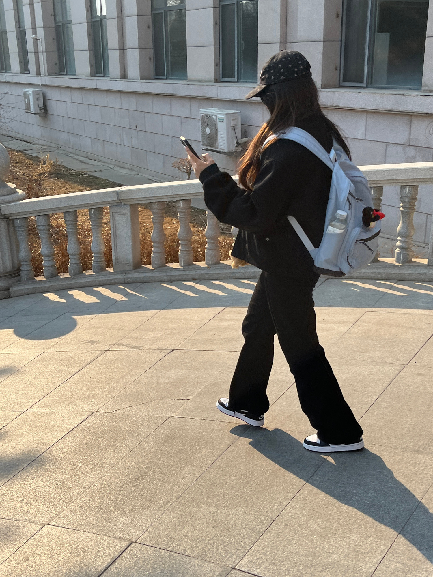 An individual is depicted walking from right to left on a tiled pedestrian path, illuminated by sunlight casting long shadows. The scene is located in Changchun City, China. The person is wearing a bl…read more