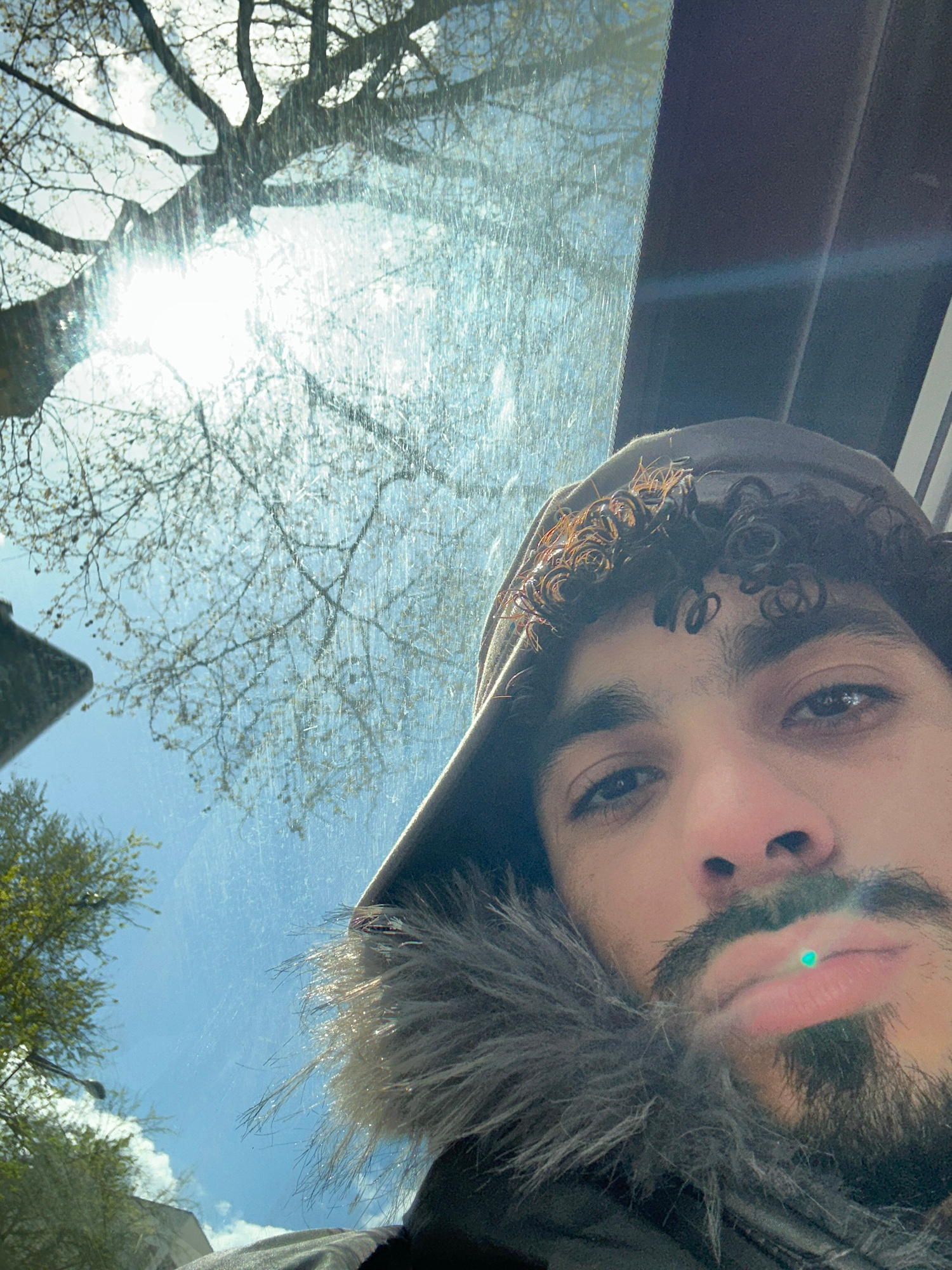 A young adult male is depicted in a close-up, low-angle self-portrait within what appears to be a vehicle. His face occupies the lower-right portion of the frame. He has dark, curly hair with some reddish-brown highlights, a dark beard, and a mustache. His dark eyes are directed towards the camera. He wears a dark hooded jacket, with a visible grayish-brown faux fur trim around the hood near his right cheek. A distinct bright green light artifact is present on his lower lip. The background, viewed through a glass pane (likely a windshield or window), reveals a bright blue sky with scattered clouds and the silhouettes of bare or newly budding tree branches. A significant sun flare is prominent in the upper-left quadrant of the image. The interior structure of the vehicle is partially visible as a dark element in the upper-right. This scene is located in Les Ulis, France. | Open Wire