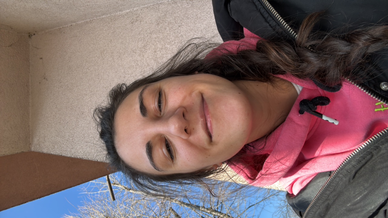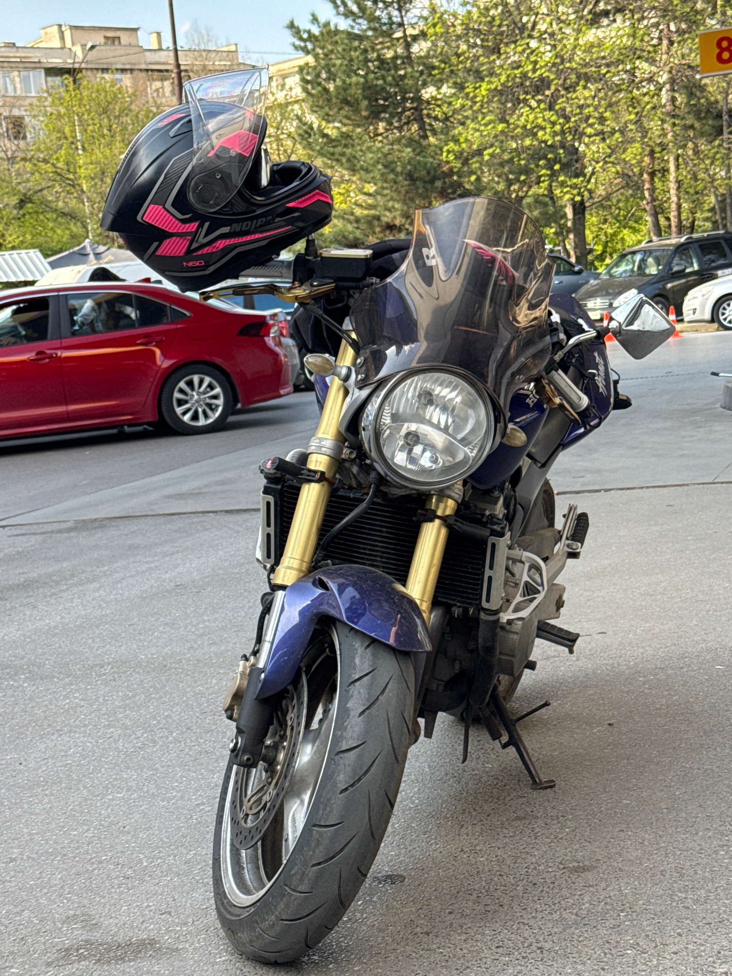 The image shows a blue motorcycle parked on the street in Sofia, Bulgaria. A black and pink motorcycle helmet is hanging on the handlebars. Behind the motorcycle is a red car and other parked vehicles…read more