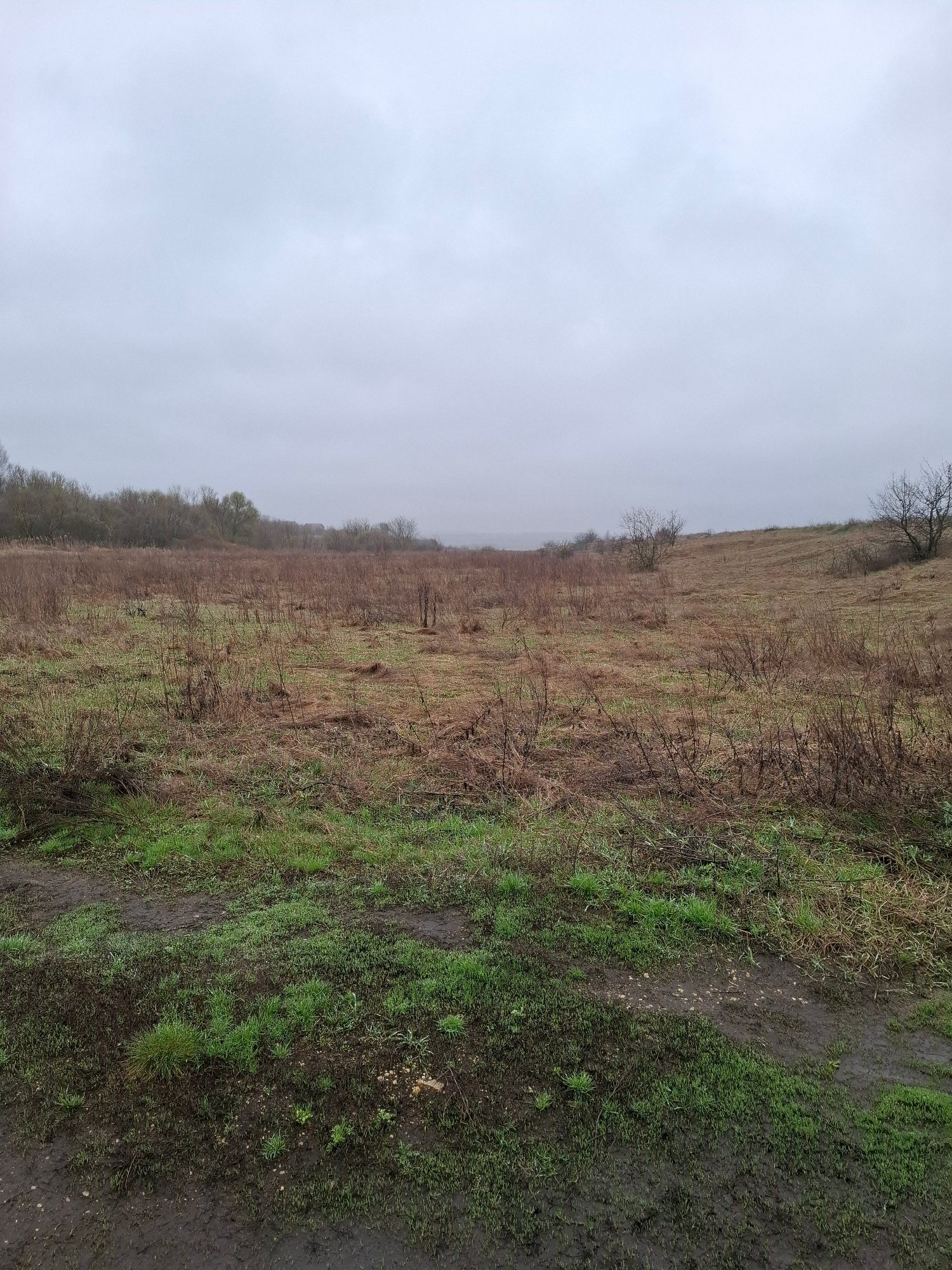 The image shows a landscape in Khlevnoye, Russia, under an overcast sky. A field stretches into the distance, transitioning from green grass near the bottom-right corner to mostly brown, dead vegetati…read more