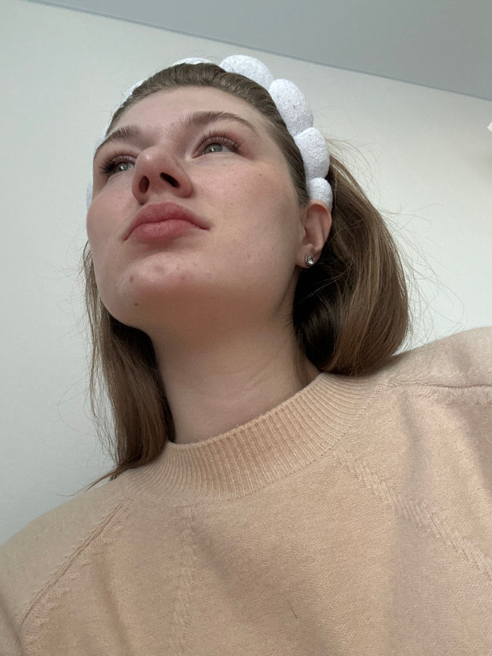 A woman with fair skin and brown hair gazes at the camera, adorned with a white headband. She wears a light beige sweater. Her lips are full, and her gaze is direct. The background is a plain white wa…read more