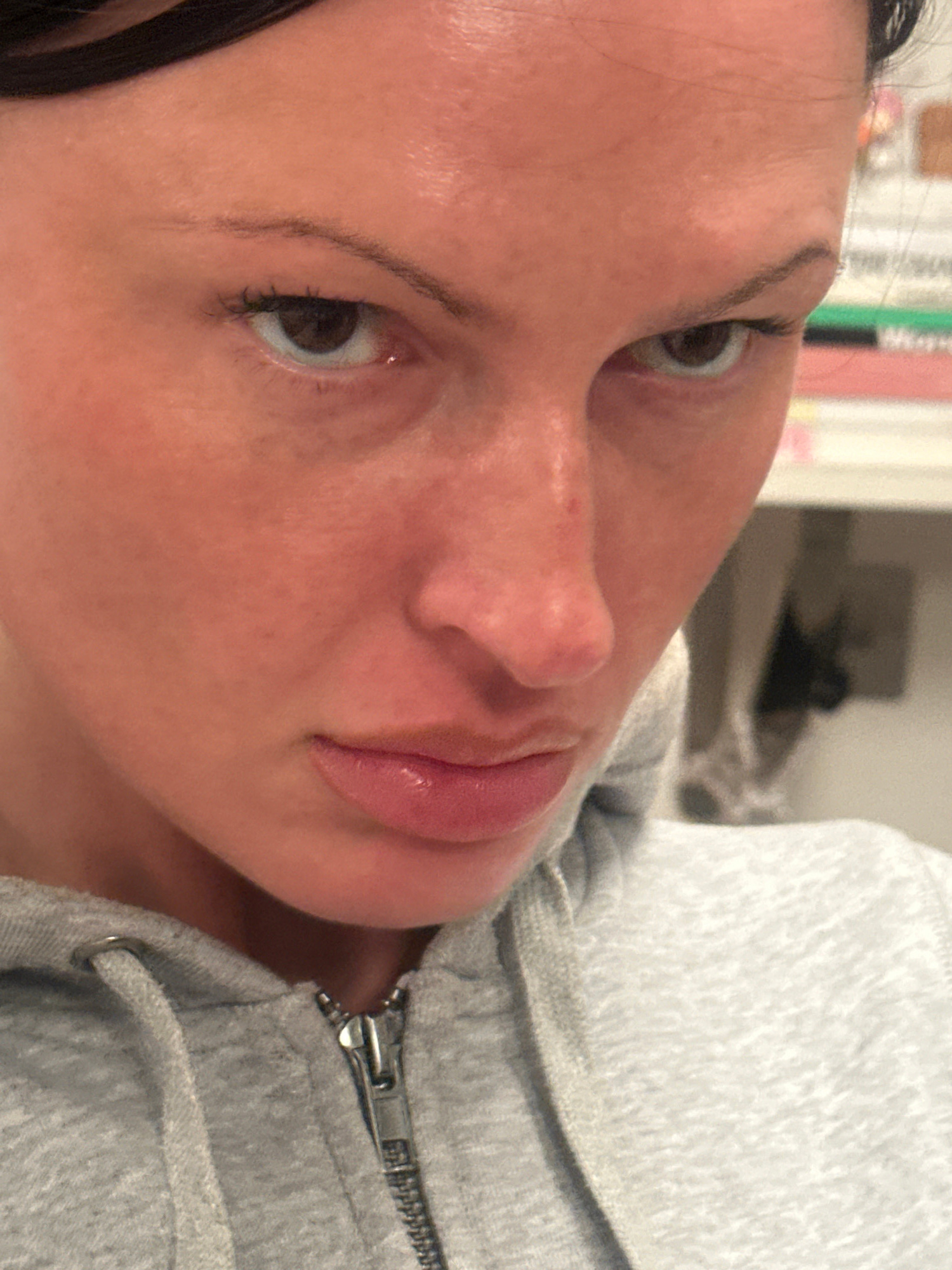 An adult female, characterized by dark hair, dark brown eyes, and a flushed complexion, occupies the majority of the frame in a close-up portrait. She presents a direct, unwavering gaze towards the vi…read more