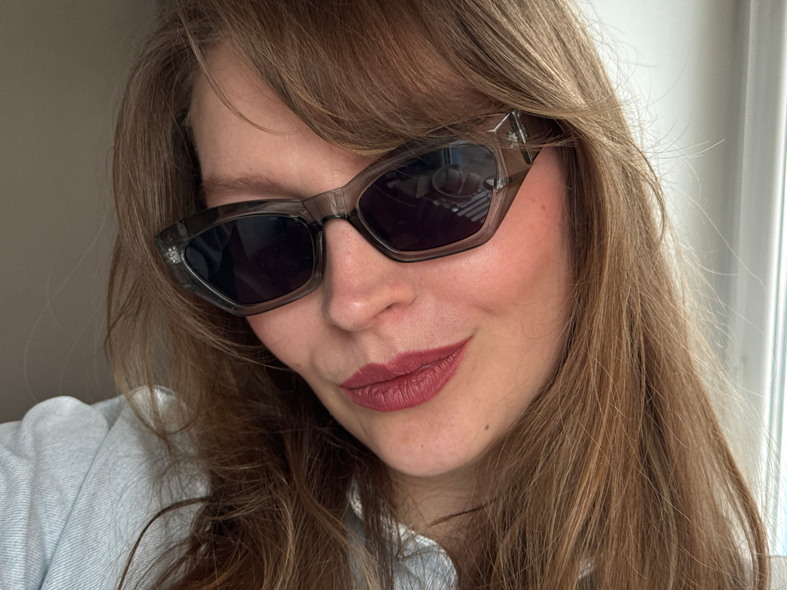 A woman with light brown hair is wearing sunglasses and lipstick. She is wearing a light blue shirt. The image is rotated upside down. The location is not evident from the image and cannot be determin…read more