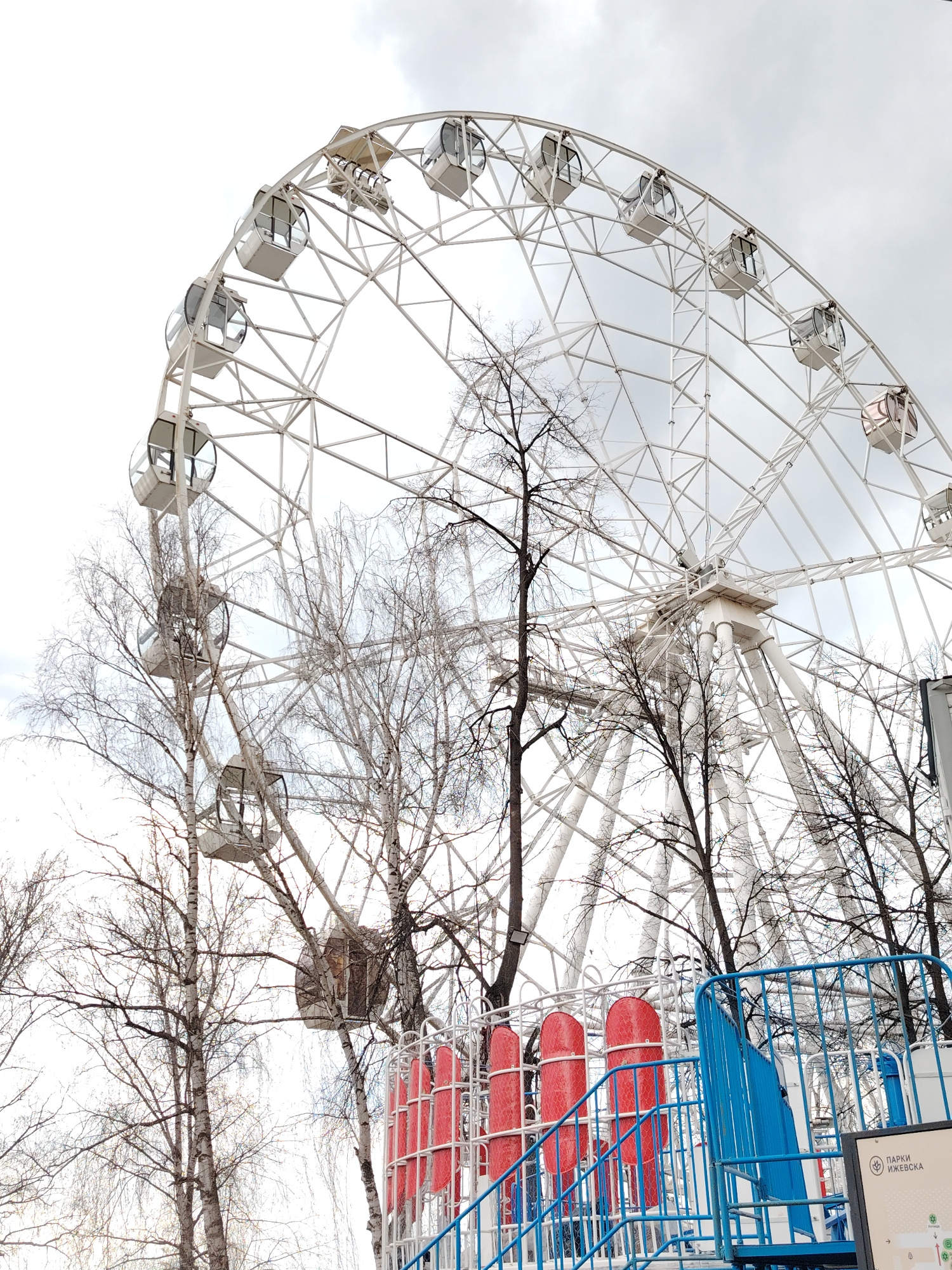 The image shows a Ferris wheel, likely in a park in Izhevsk, Russia, based on the park information sign. The Ferris wheel has white structural supports and enclosed cabins. Several leafless trees part…read more