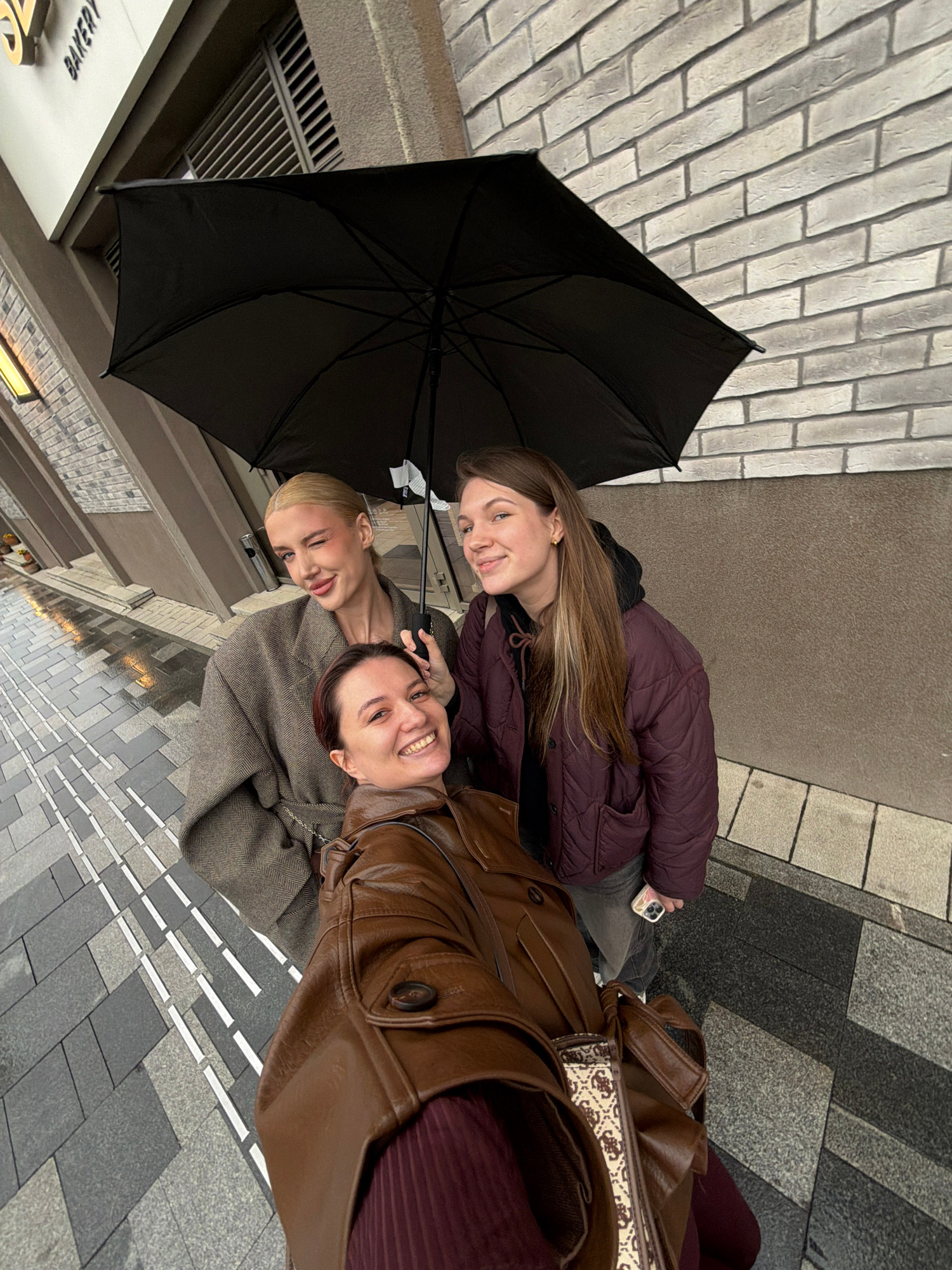 Three women are posing for a photograph under an open black umbrella. The first woman has long, blonde hair and is wearing a burgundy puffer jacket. She is holding a cell phone. The second woman has…read more