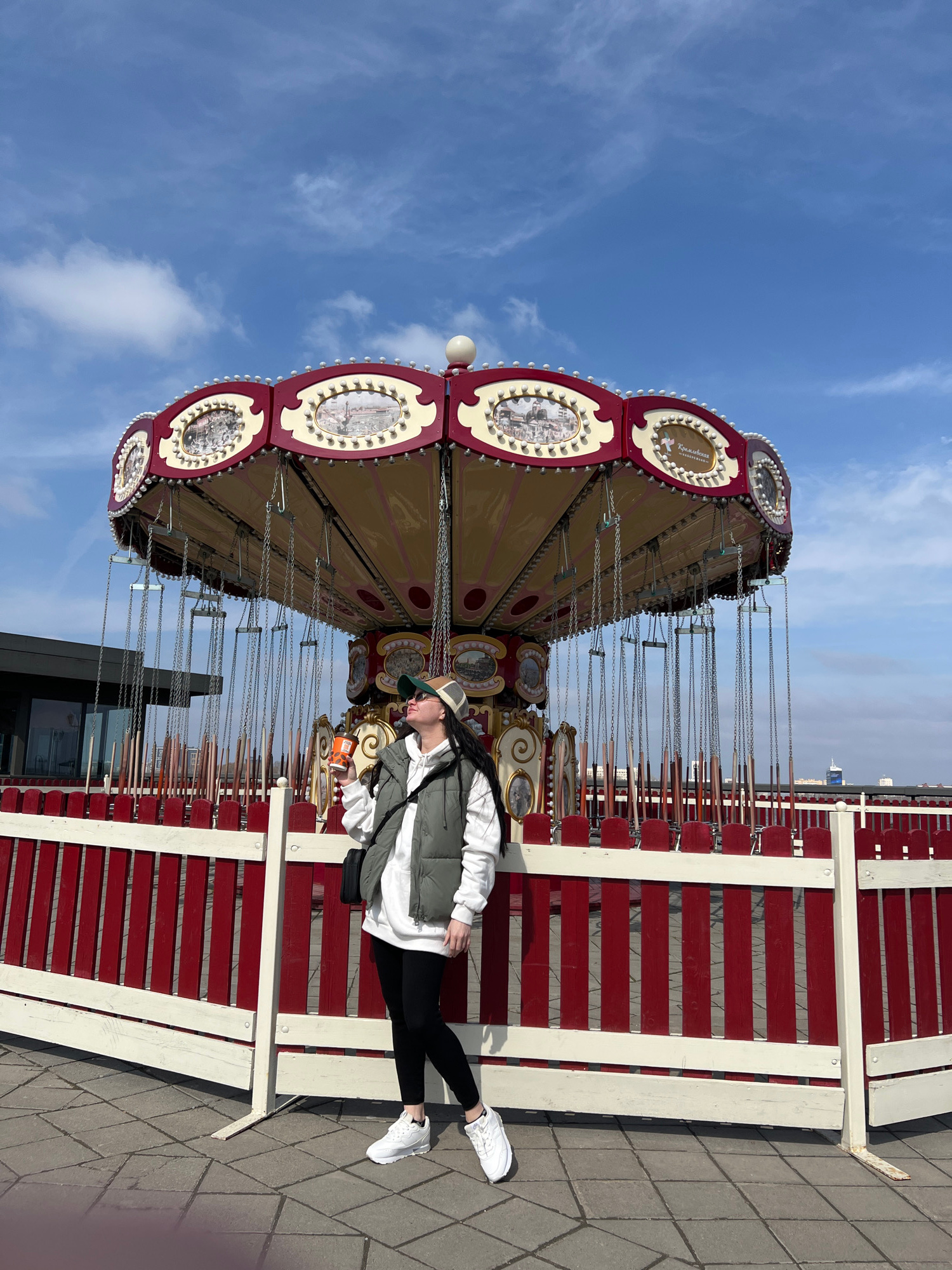 The image shows a woman standing near a carousel in Kazan, Russia. The carousel has a beige and maroon color scheme with decorative elements. The woman is wearing a white sweatshirt, a green vest, bla…read more