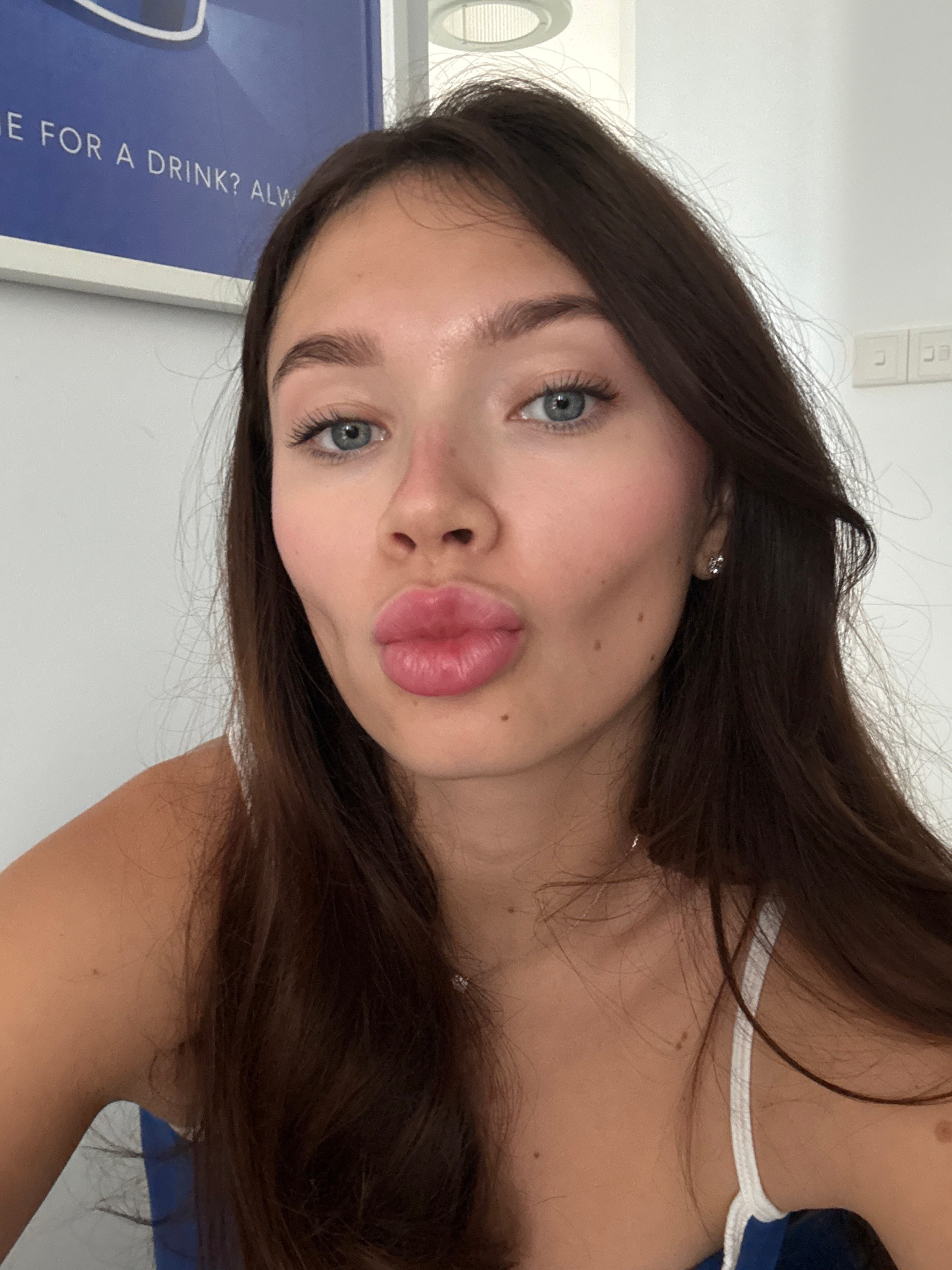 A young woman with long, dark brown hair and light blue eyes is facing the camera with a pouting expression. She has fair skin with a few visible freckles. She appears to be indoors, with a white wall…read more