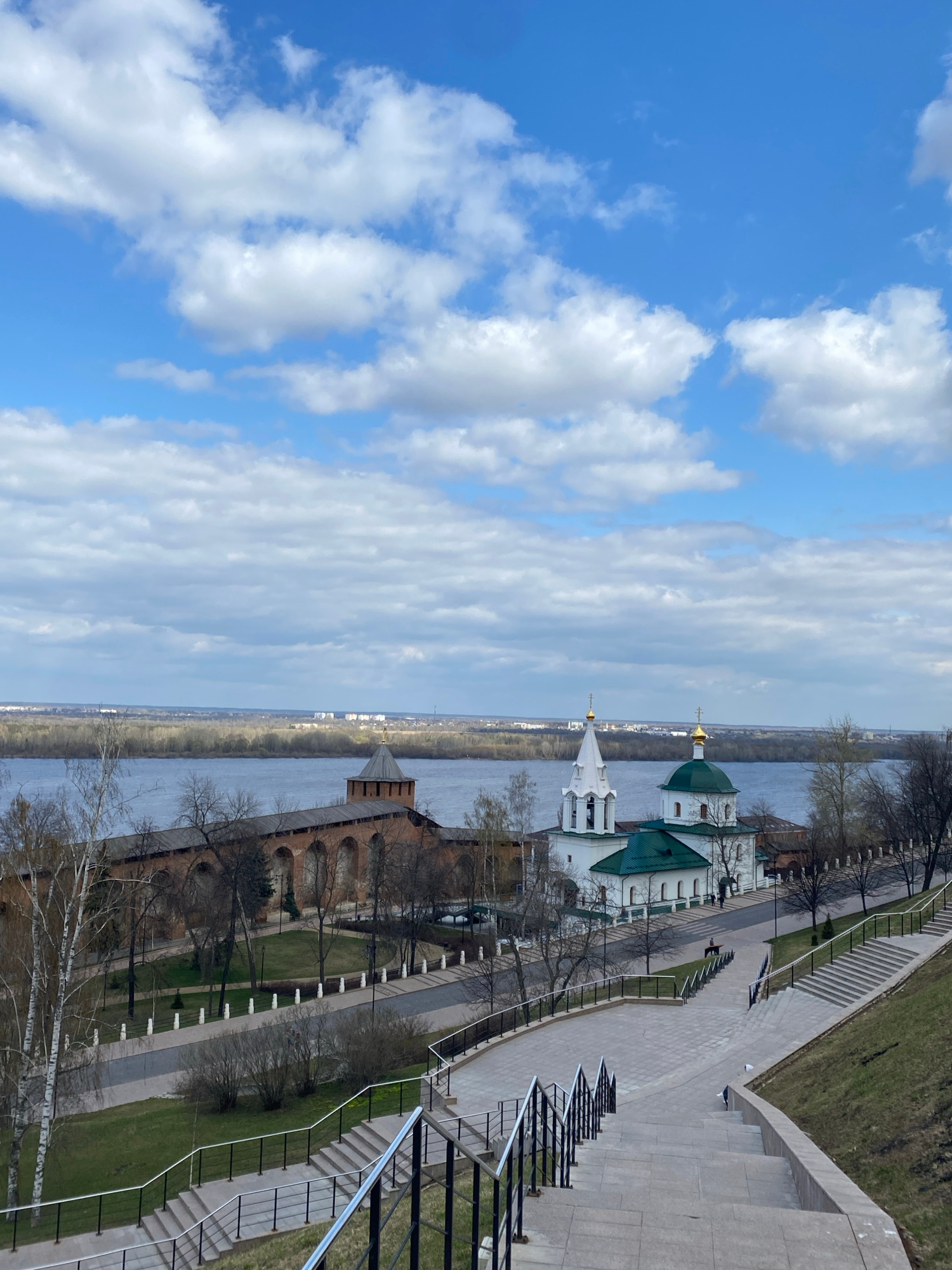 This panoramic photograph, captured from an elevated viewpoint, showcases a scenic riverfront area in Nizhny Novgorod, Russia. The sky, a vibrant blue with scattered white cumulus clouds, dominates th…read more