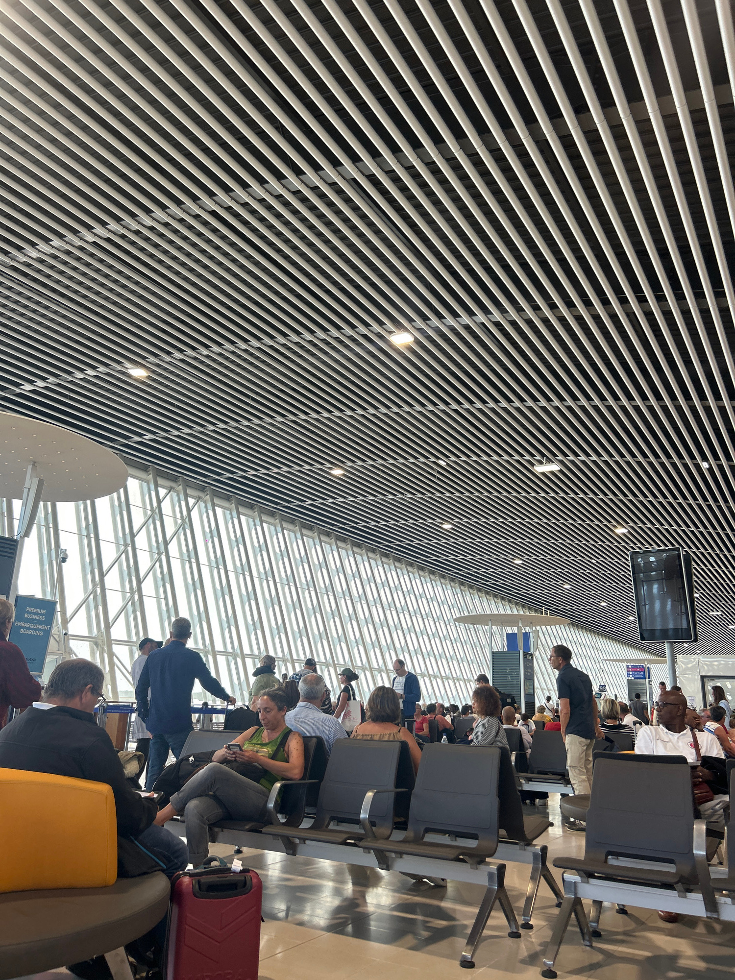 The image depicts an airport waiting area, likely in Les Abymes, France. The scene includes a number of people seated in rows of gray chairs, some with luggage nearby. A man in a blue shirt is standin…read more