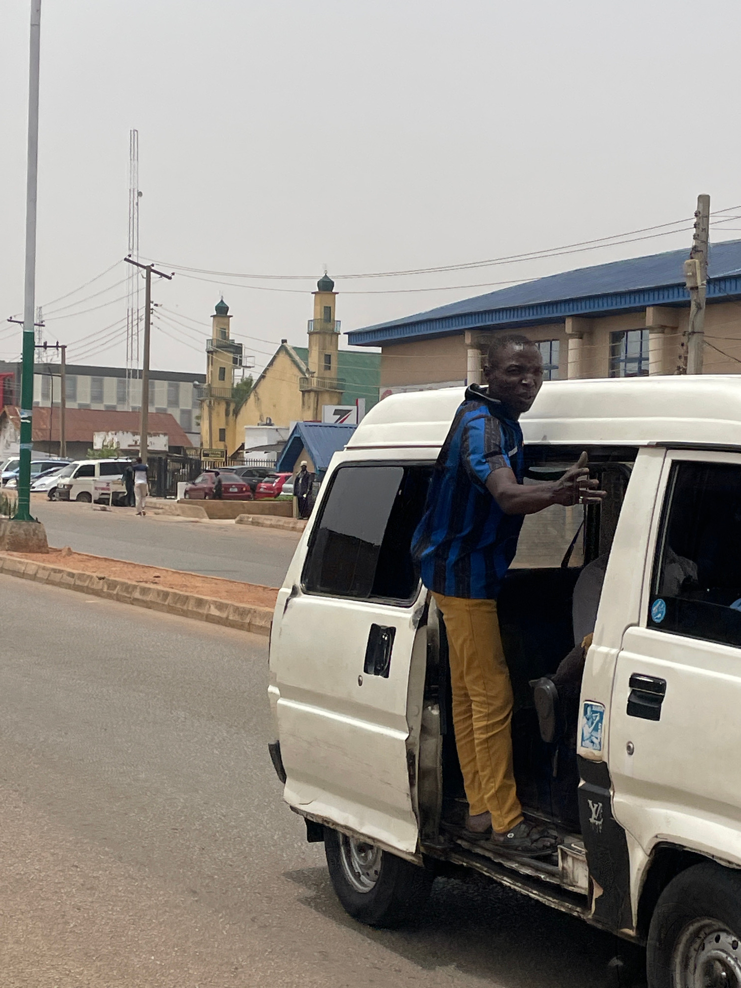 The image shows a man standing by a white van, seemingly waving or gesturing with his right hand. The man is wearing a blue and black striped shirt and yellow pants. He is positioned by the open drive…read more