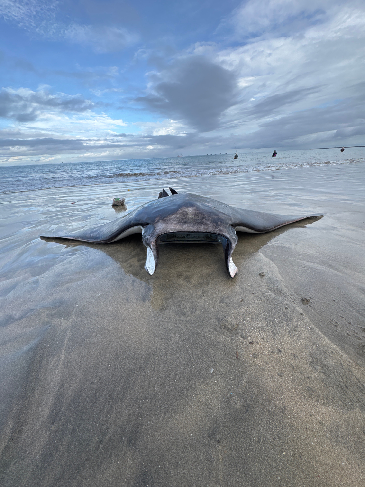 A dead manta ray lies on a sandy beach under a cloudy sky. The location is Kuta Selatan, Indonesia. The ray is lying on its back, with its wing-like pectoral fins spread out on either side. The fins h…read more