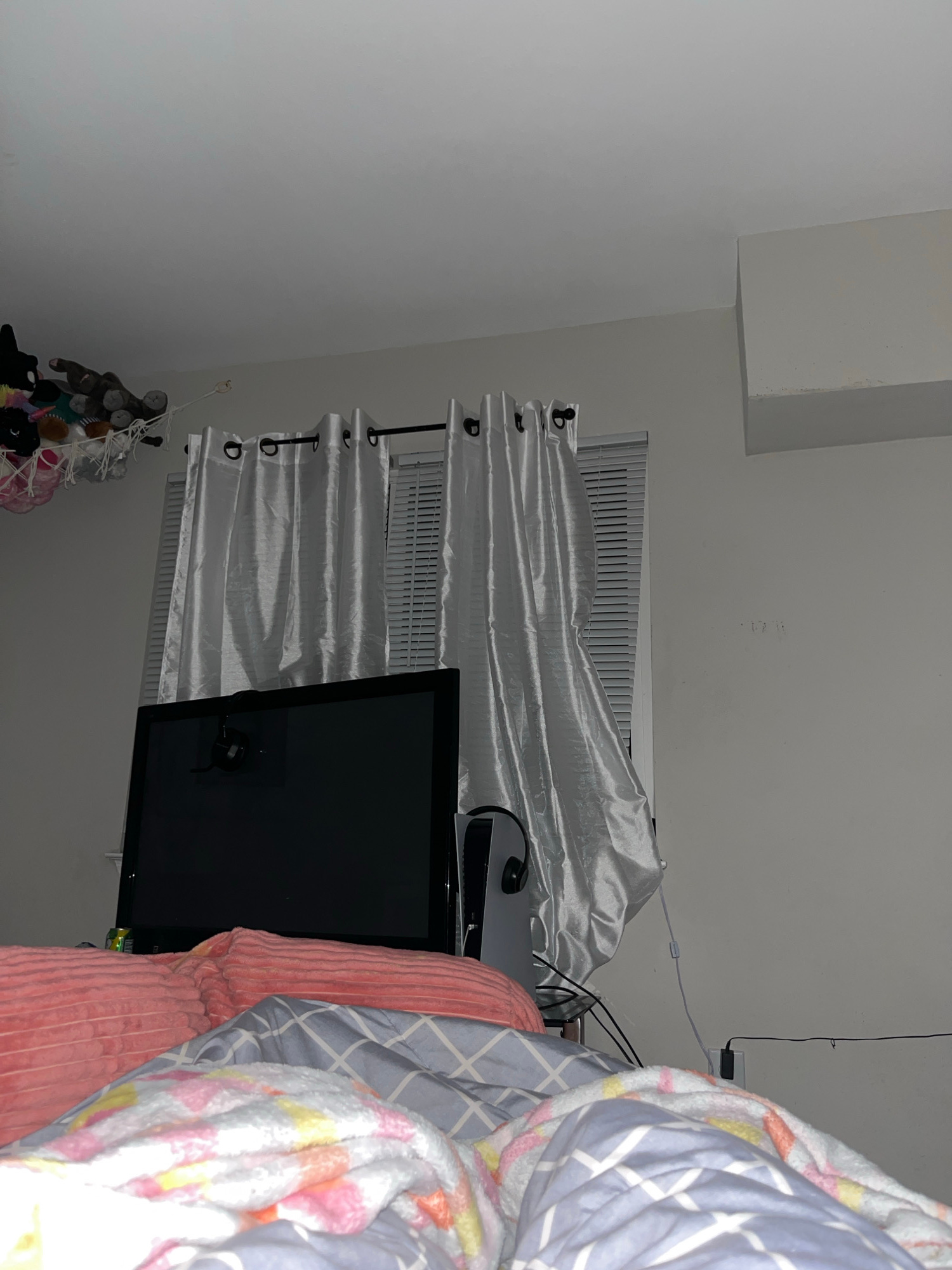 The image depicts an indoor scene, potentially a bedroom, with a window covered by what appears to be a silvery fabric, possibly curtains or a sheet. In front of the window is a mounted flat-screen te…read more