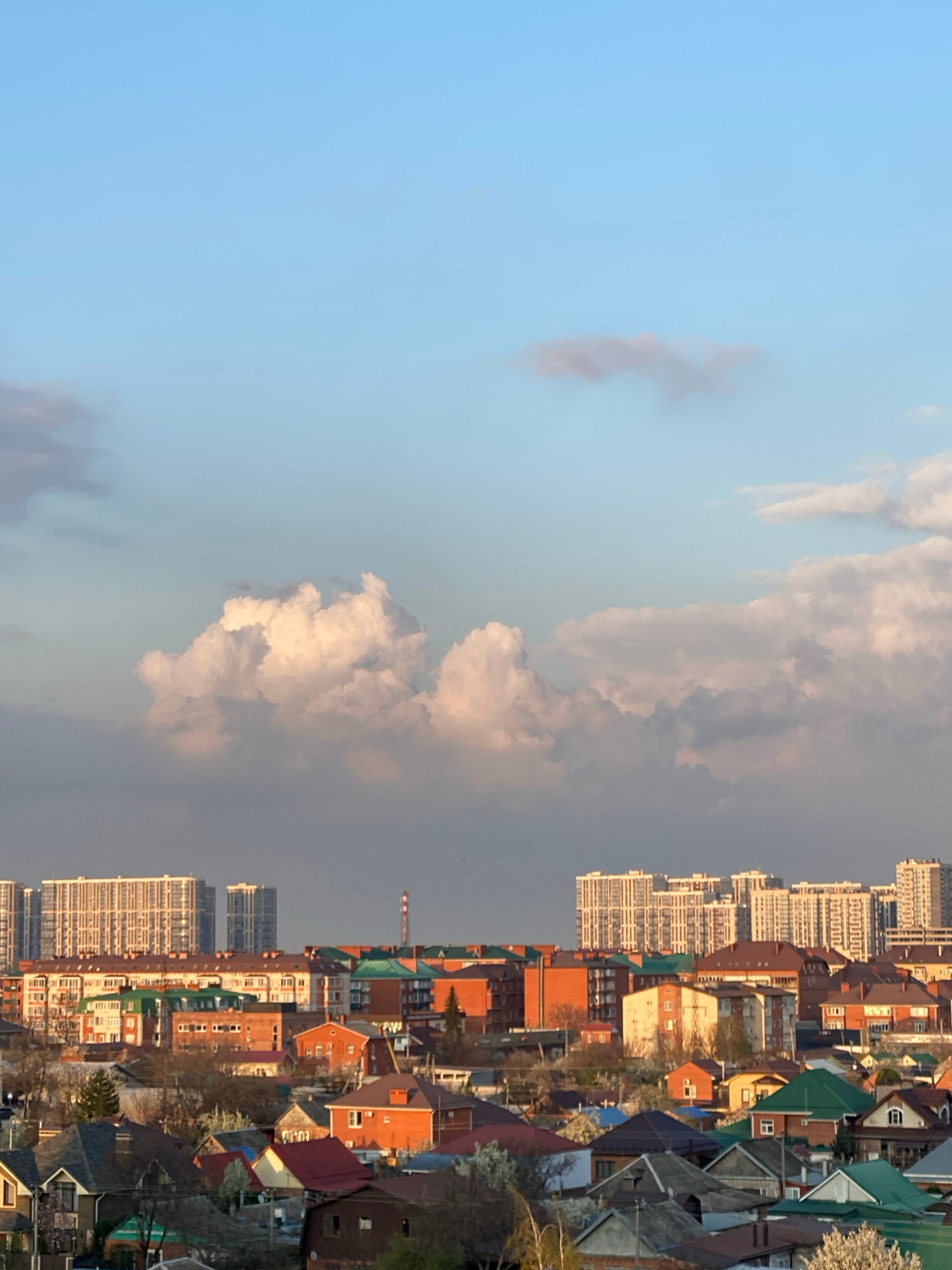 The image shows a mixed urban landscape in an unknown city. High-rise apartment buildings are interspersed with lower-density residential housing with varied roof colors (red, green, blue). A construc…read more