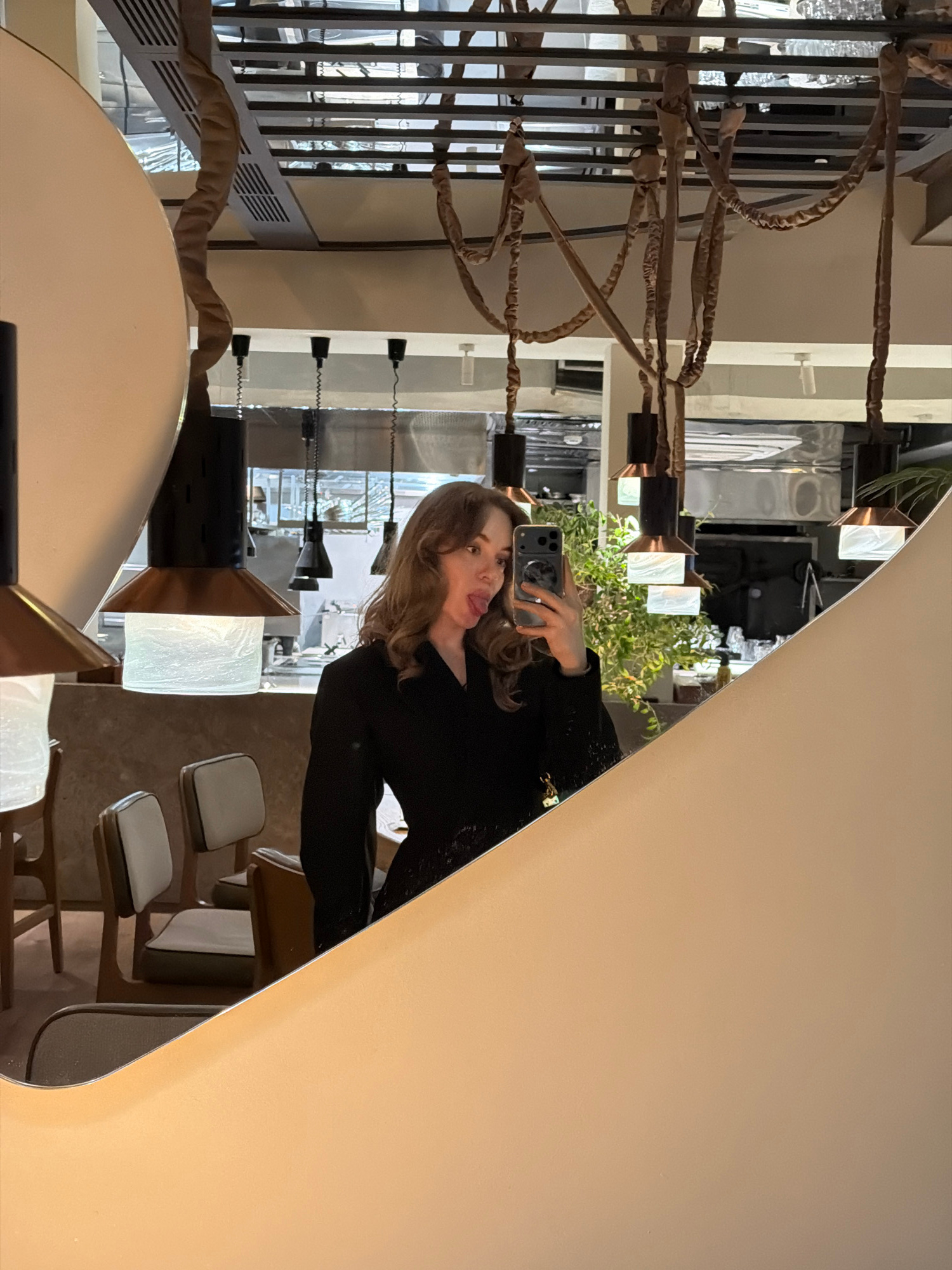 A woman takes a selfie in front of a mirror in what appears to be a restaurant setting. The scene is from Moscow, Russia. The woman is wearing a black long-sleeved top and holds a phone. She is making…read more