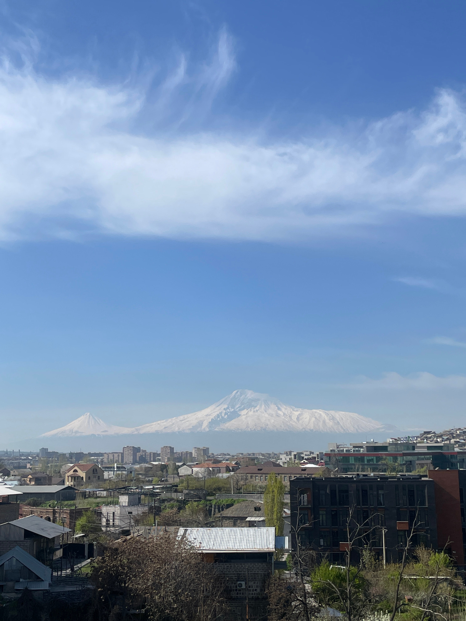 The image displays a panoramic view of an urban landscape set against a backdrop of majestic, snow-capped mountains under a clear blue sky. The sky, occupying the upper portion of the frame, is a brilβ¦read more