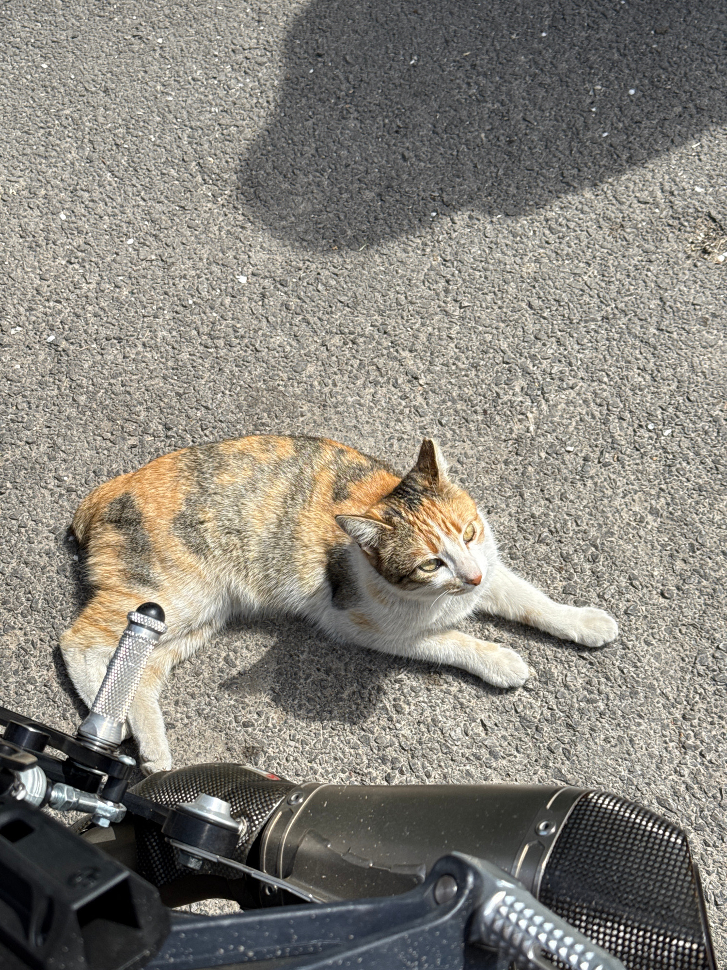 A calico cat lies on asphalt next to a motorcycle in Bozhurishte, Bulgaria. The cat is positioned in the center of the image, on its back, with its legs outstretched towards the upper right corner of…read more
