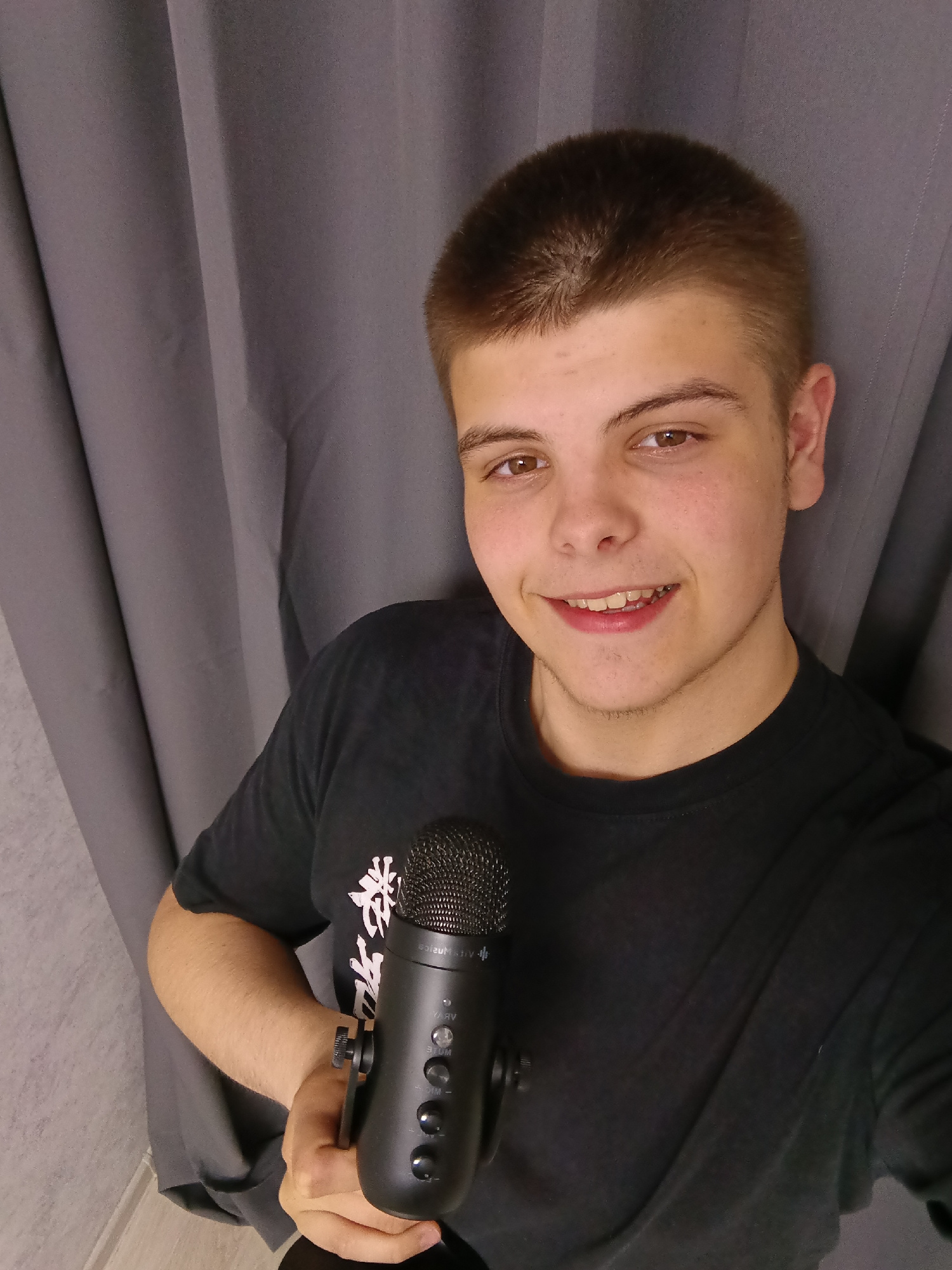 A young Caucasian male is holding a microphone, posing for a selfie. He has short brown hair, brown eyes, and is smiling. He is wearing a black t-shirt with a white design. Behind him is a gray curtai…read more