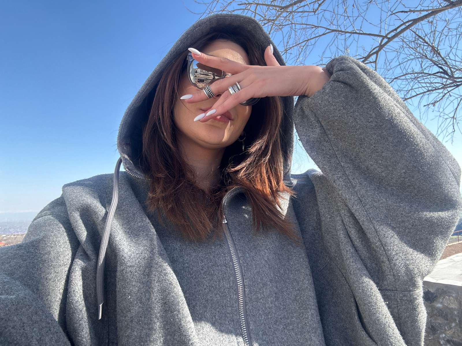 The image presents an upward-angled, close-up shot of a person looking directly into a clear blue sky. The individual is wearing a grey, textured zippered hoodie or jacket, with the hood pulled up aro…read more