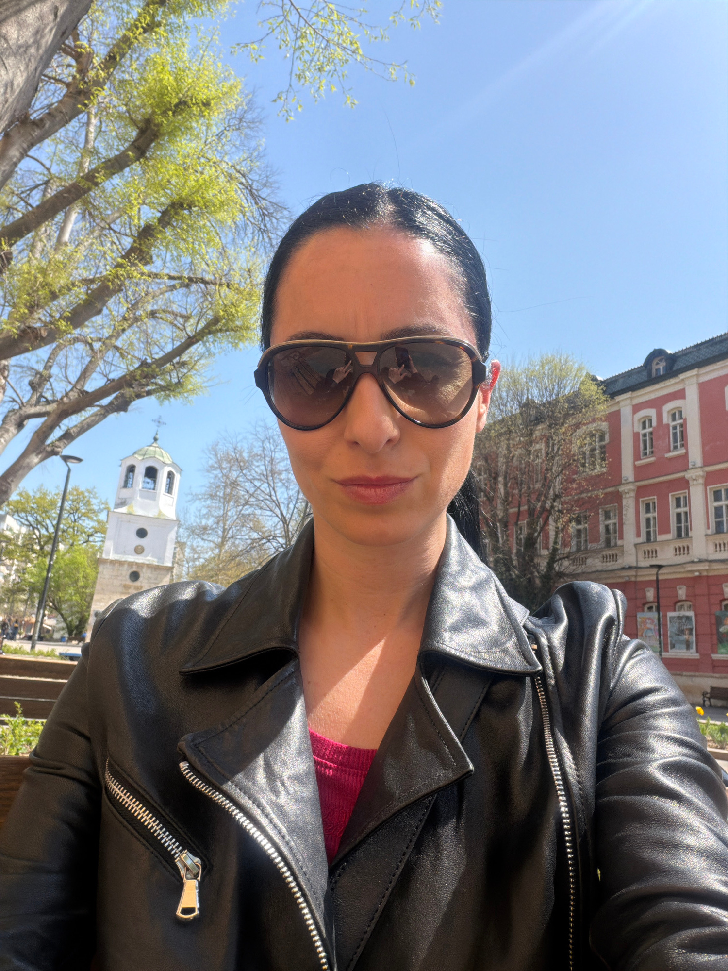 An image, rotated 90 degrees clockwise, captures a close-up selfie of a person outdoors on a bright, sunny day, likely in Pleven, Bulgaria. The individual, appearing to be a woman, has dark hair pulle…read more