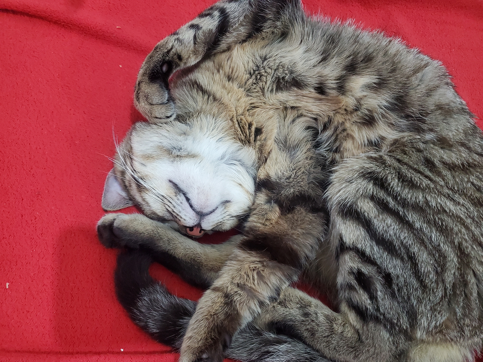 The media file features a domestic tabby cat in a state of deep sleep, curled up comfortably on a bright red, soft-textured blanket or fabric surface. The cat's fur is a mosaic of grey, brown, and cre…read more