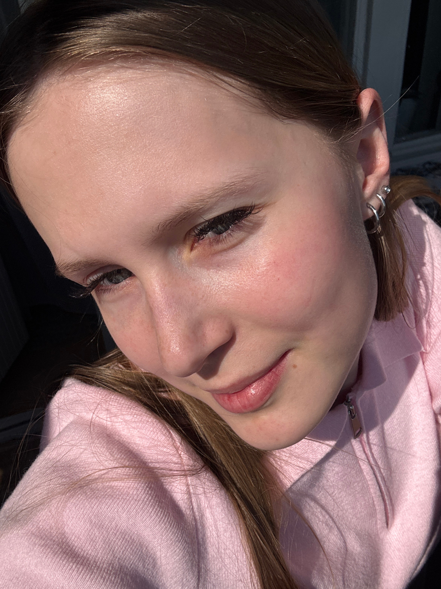 A close-up, angled portrait captures the face and upper body of a young person in Chaikovsky, Russia. The subject, likely female, has fair skin, light brown hair, and is wearing a pink hooded sweatshi…read more