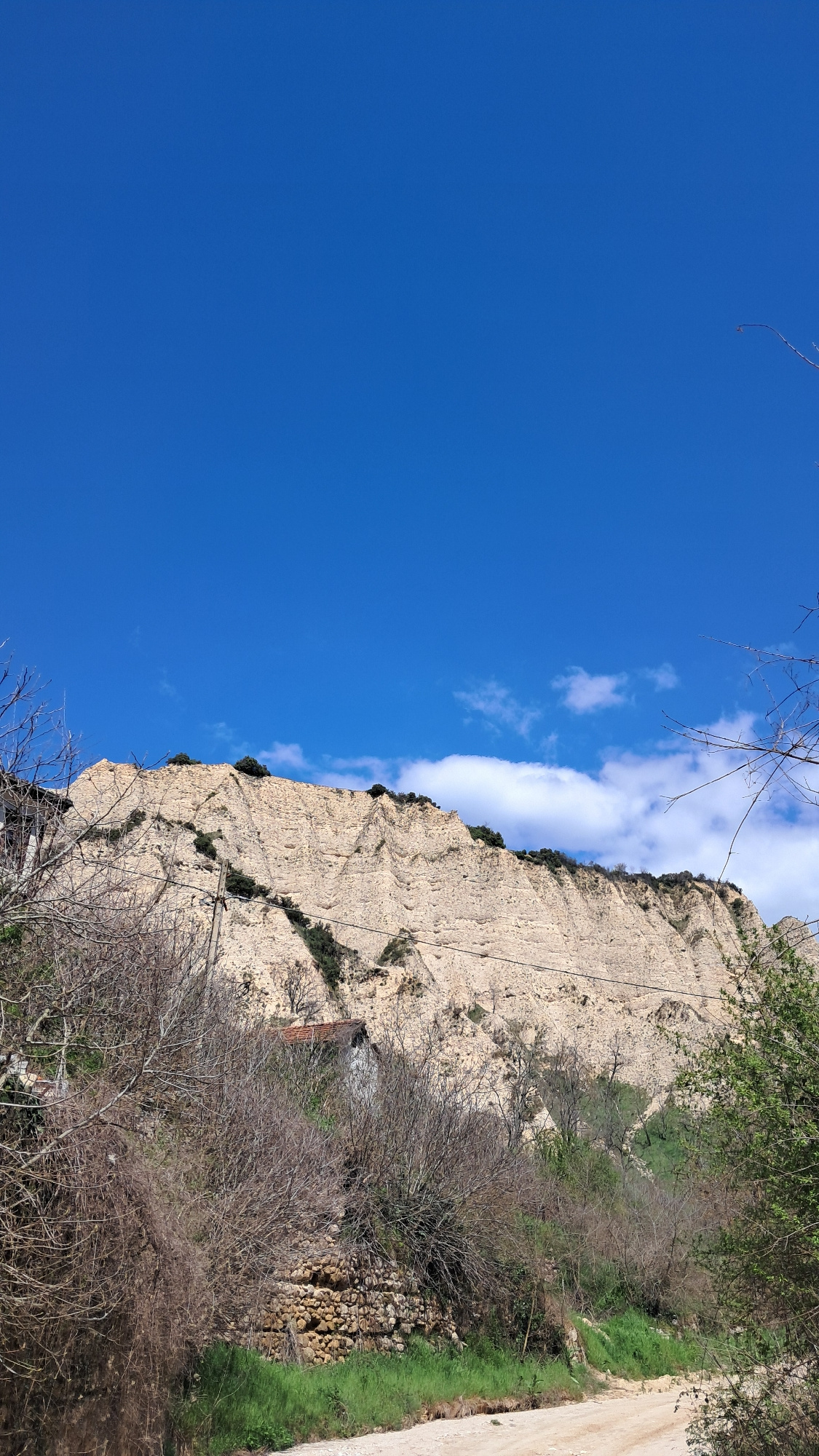 The image shows a cliff face on the outskirts of Melnik, Bulgaria. The cliff is beige, textured, and partially vegetated with shrubs and trees. A clear blue sky occupies the left side of the image, wi…read more